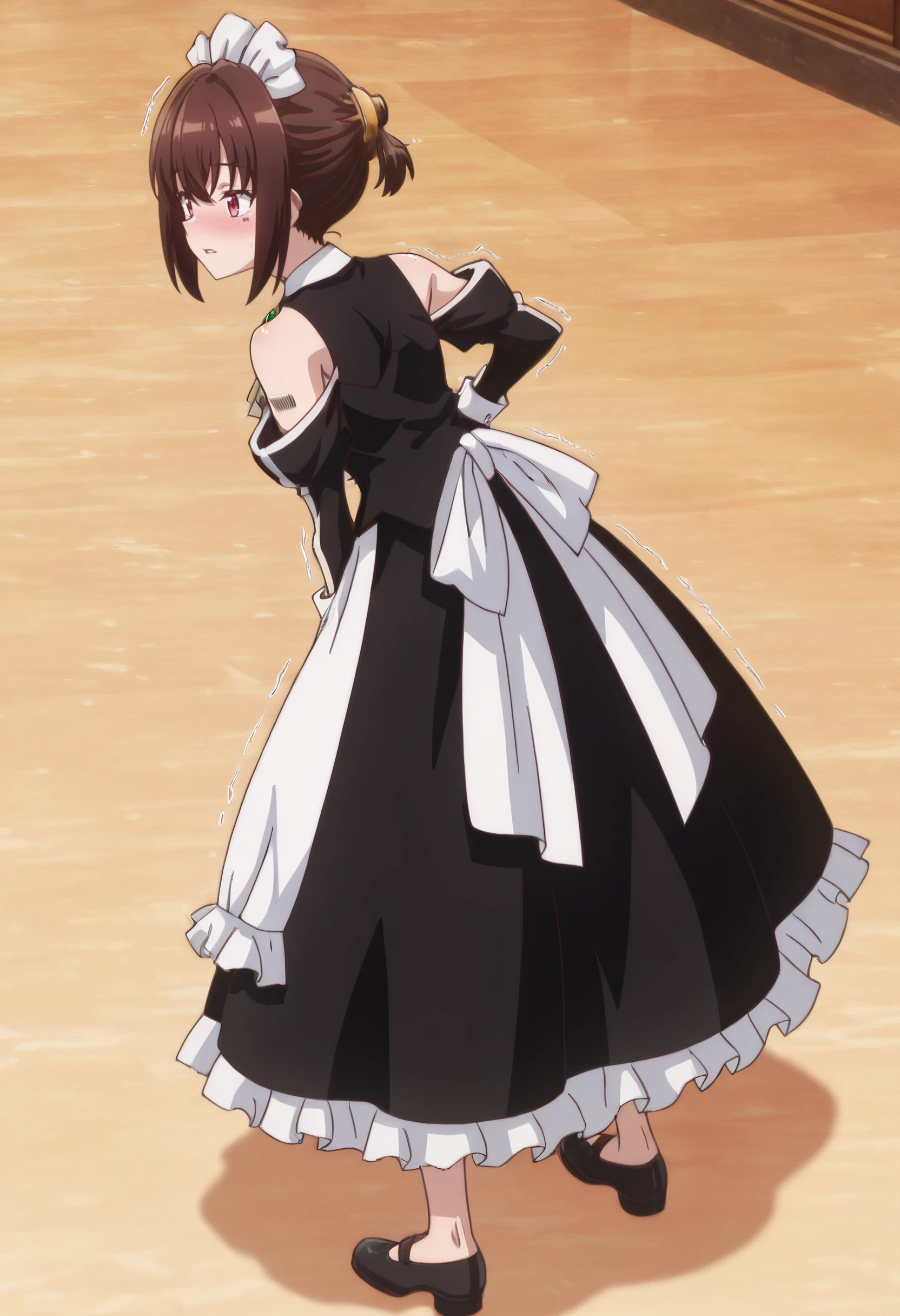ArashimaOutfit, maid, maid headdress, long sleeves, maid apron, apron, black dress, white apron, enmaided, bare shoulders, shoulder cutout, clothing cutout, frills, brooch, detached sleeves, puffy sleeves, long dress, hair ornament, collared dress, waist apron, black footwear, shoes,
