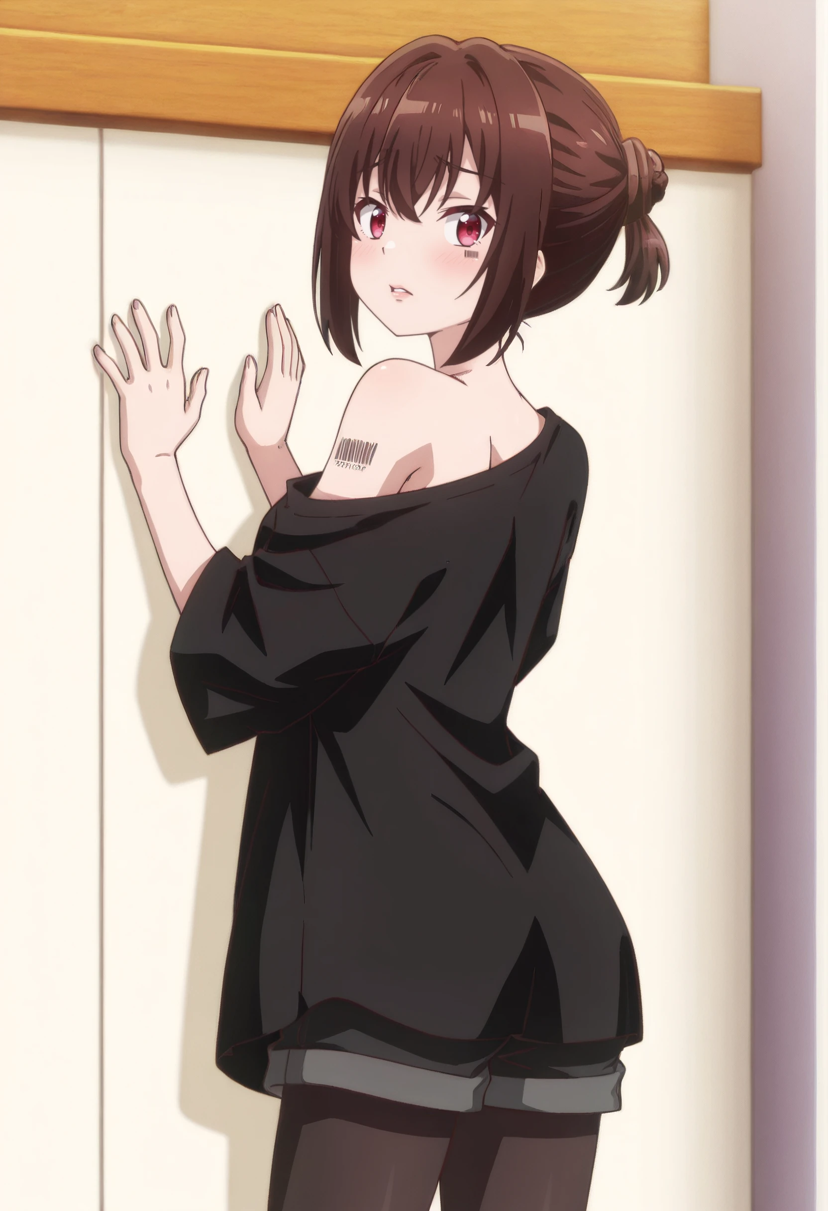 OWSArashima, brown hair, short hair, ponytail, short ponytail, red eyes, hair between eyes, hair bun, barcode tattoo, shoulder tattoo, barcode, tattoo,