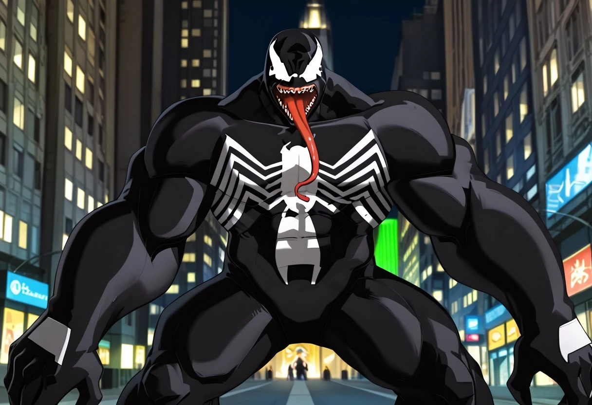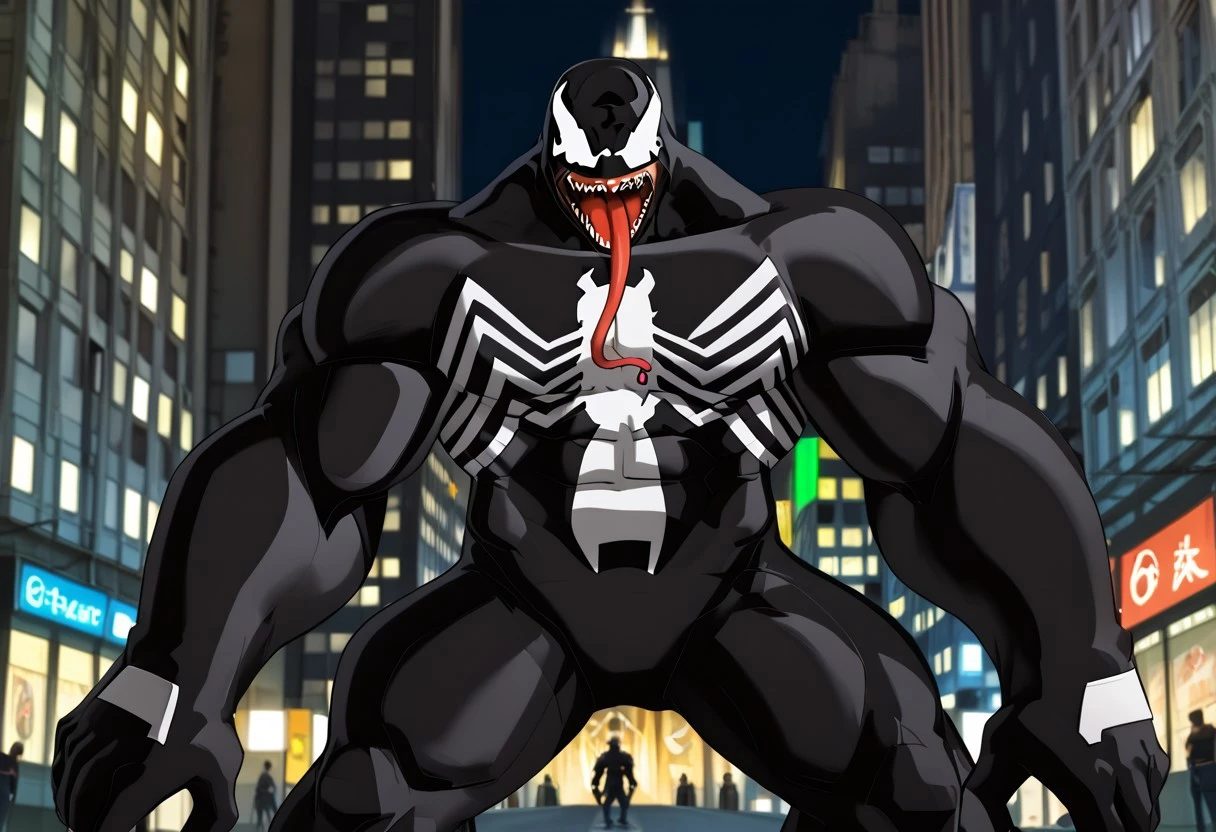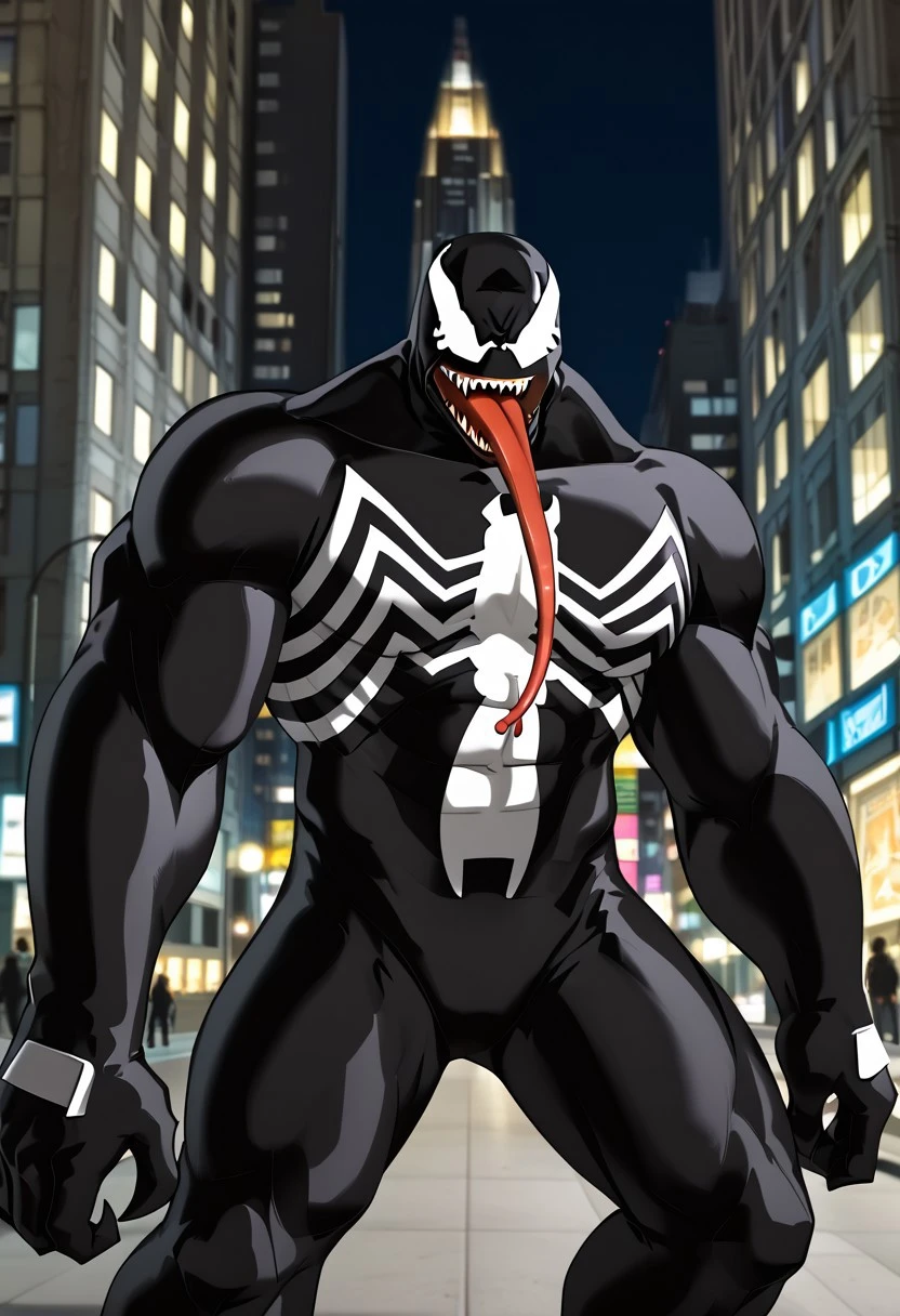ultimatevenom/(marvel)/XL, bodysuit, blacksuit, mouth, spiderprint, muscular, 1boy, solo, sharp teeth, monsterboy, long tongue,Prompt Ultimate Venom Illustrious: