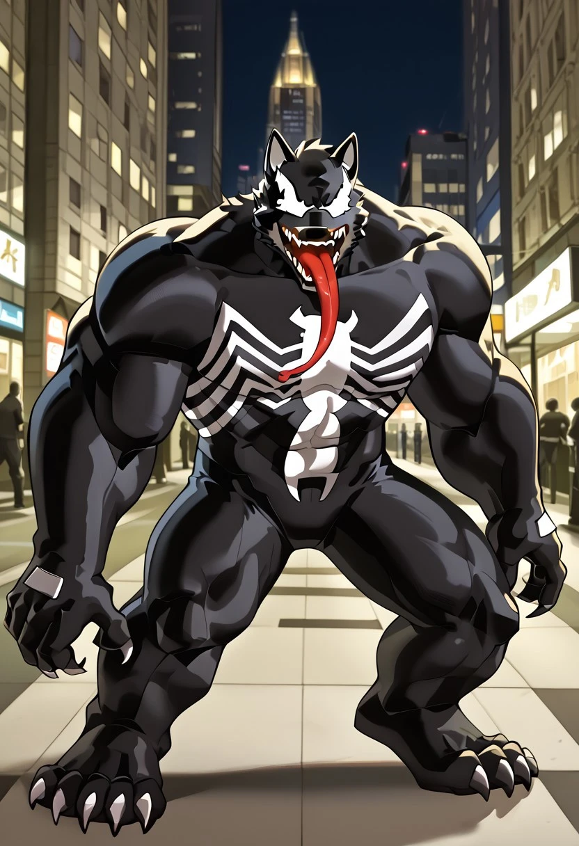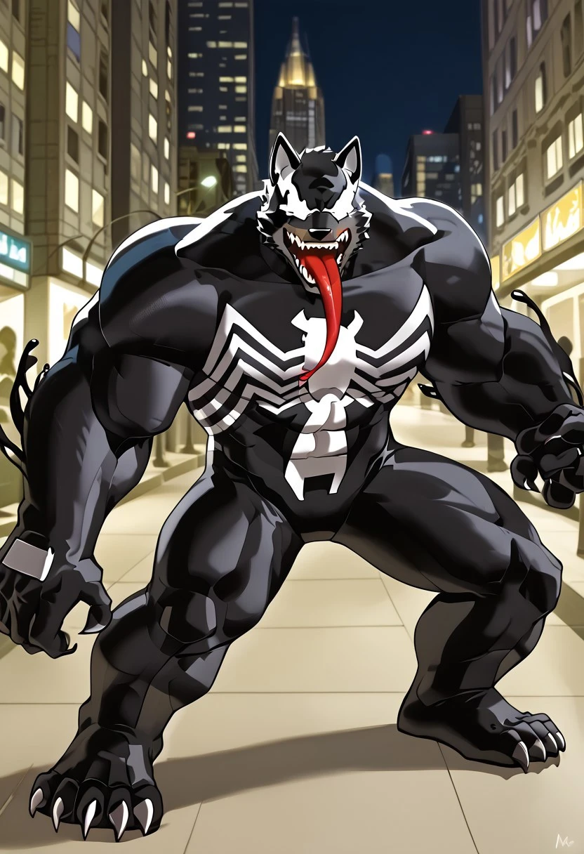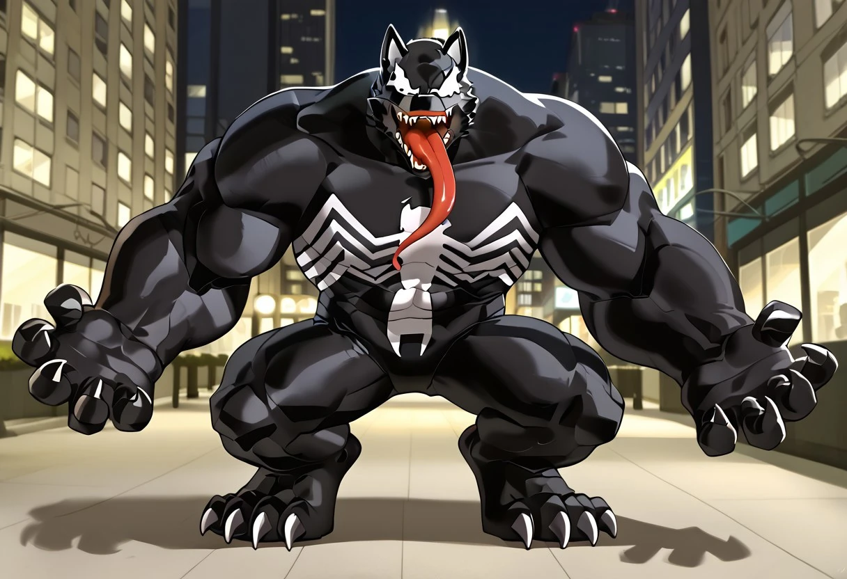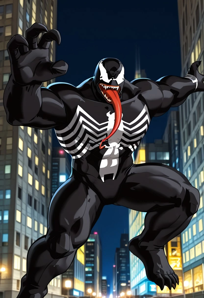 ultimatevenom/(marvel)/XL, bodysuit, blacksuit, mouth, spiderprint, muscular, 1boy, solo, sharp teeth, monsterboy, long tongue,Prompt Ultimate Venom Illustrious: