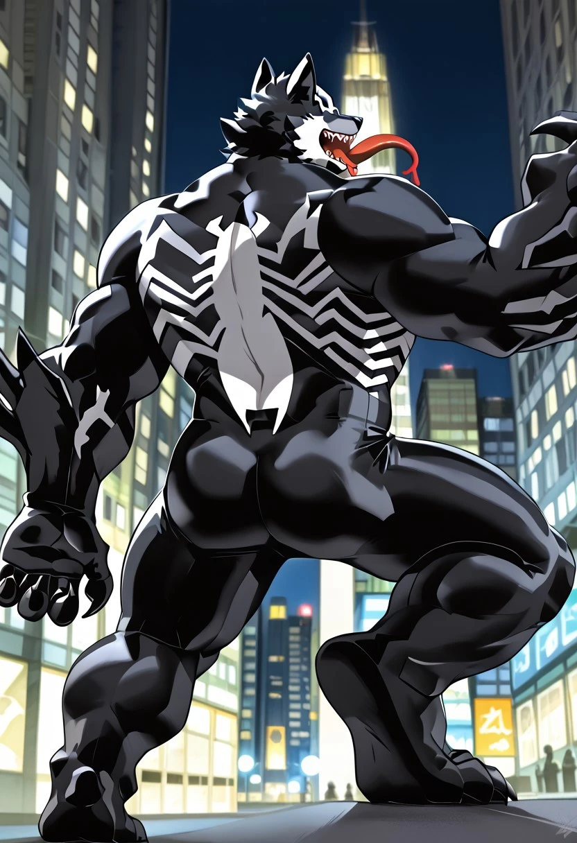 ultimatevenom/(marvel)/XL, bodysuit, blacksuit, mouth, spiderprint, muscular, 1boy, solo, sharp teeth, monsterboy, long tongue,
