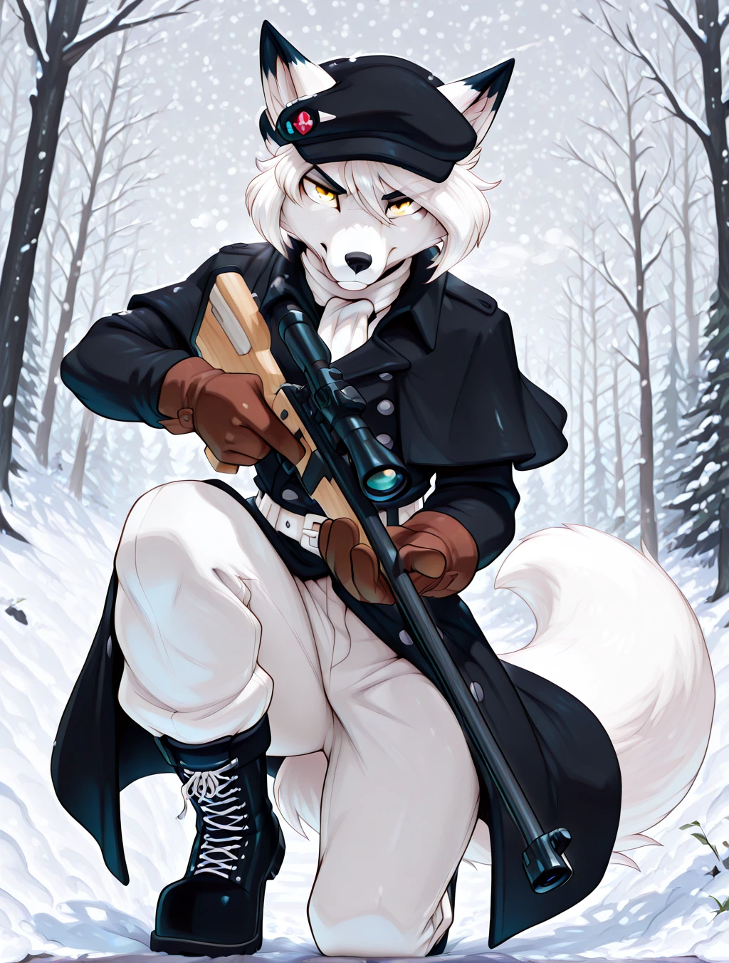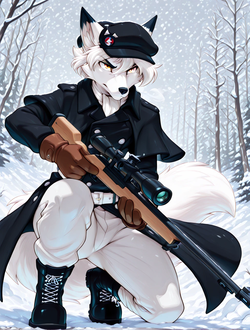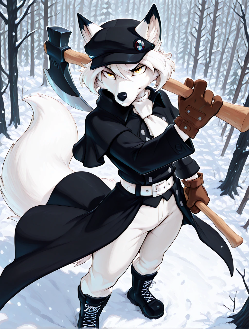(furry male, anthro, fox, white fur, white body, fox ears, fox tail, animal nose, snout, yellow eyes, white hair, short hair, smooth hair)