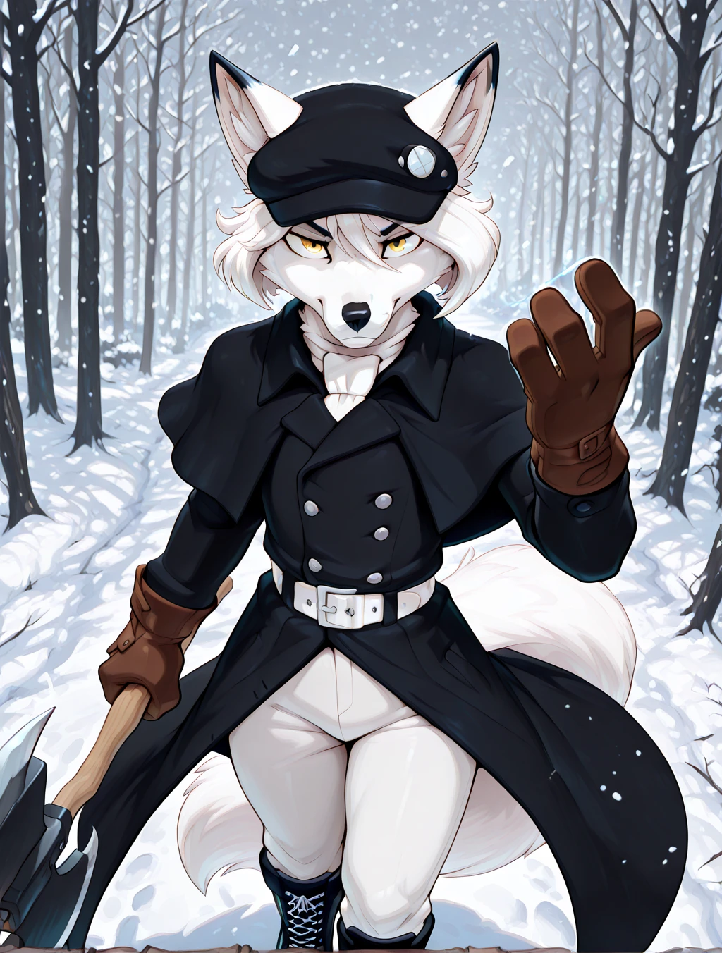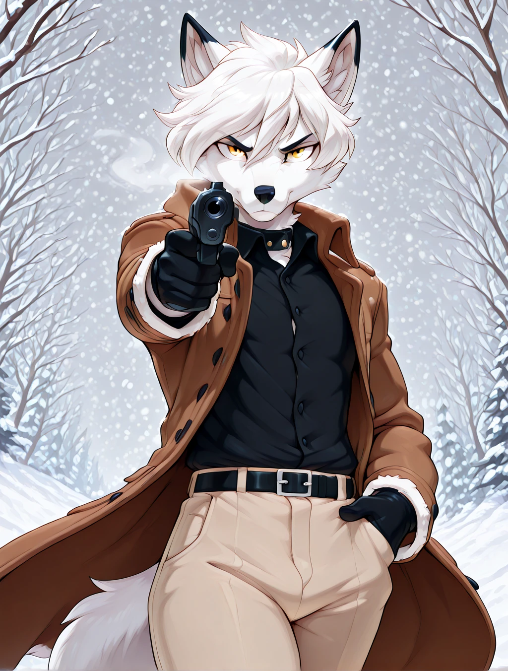(black shirt, buttoned-down shirt with collar, white fur-trim coat, long sleeves, , black gloves, tuxedo gloves, khaki pants, black belt with buckle, brown winter boots, laced-up boots)