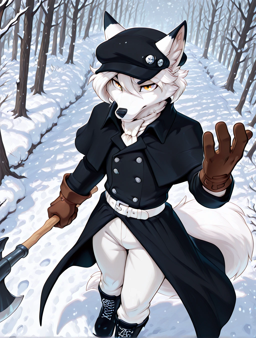 (black ivy cap, black capelet coat with buttons, long coat, white belt with a buckle, white jabot neck-tie, brown gloves, leather gloves, white pants, black snow boots, winter boots, laced-up boots)