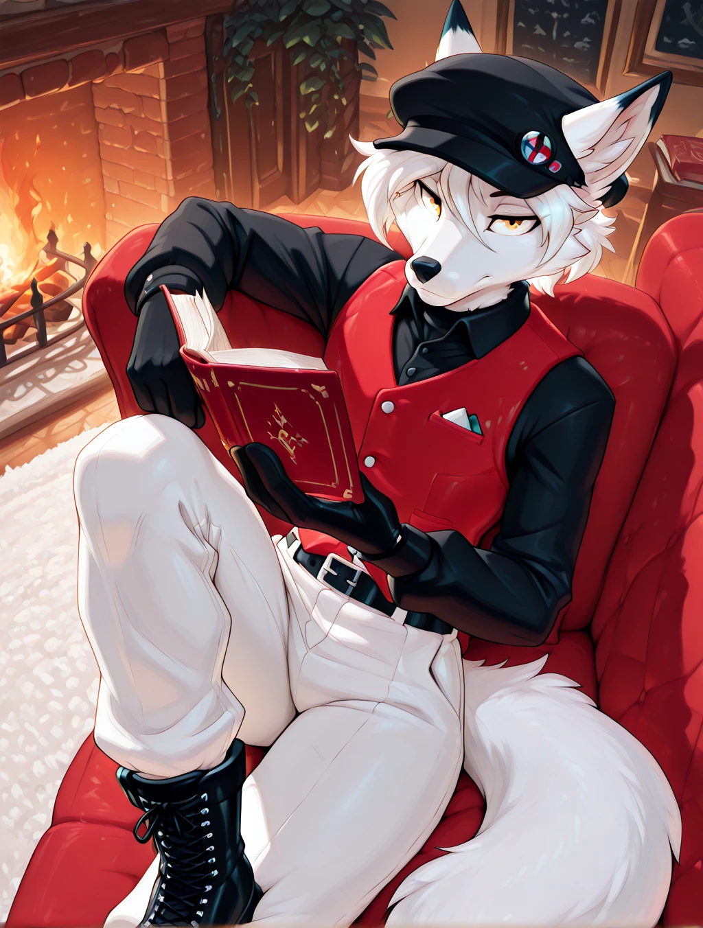 (black ivy cap, black shirt, buttoned-down shirt with collar, red line-suit vest, black gloves, tuxedo gloves, white pants, black belt with buckle, black snow boots, winter boots, laced-up boots)