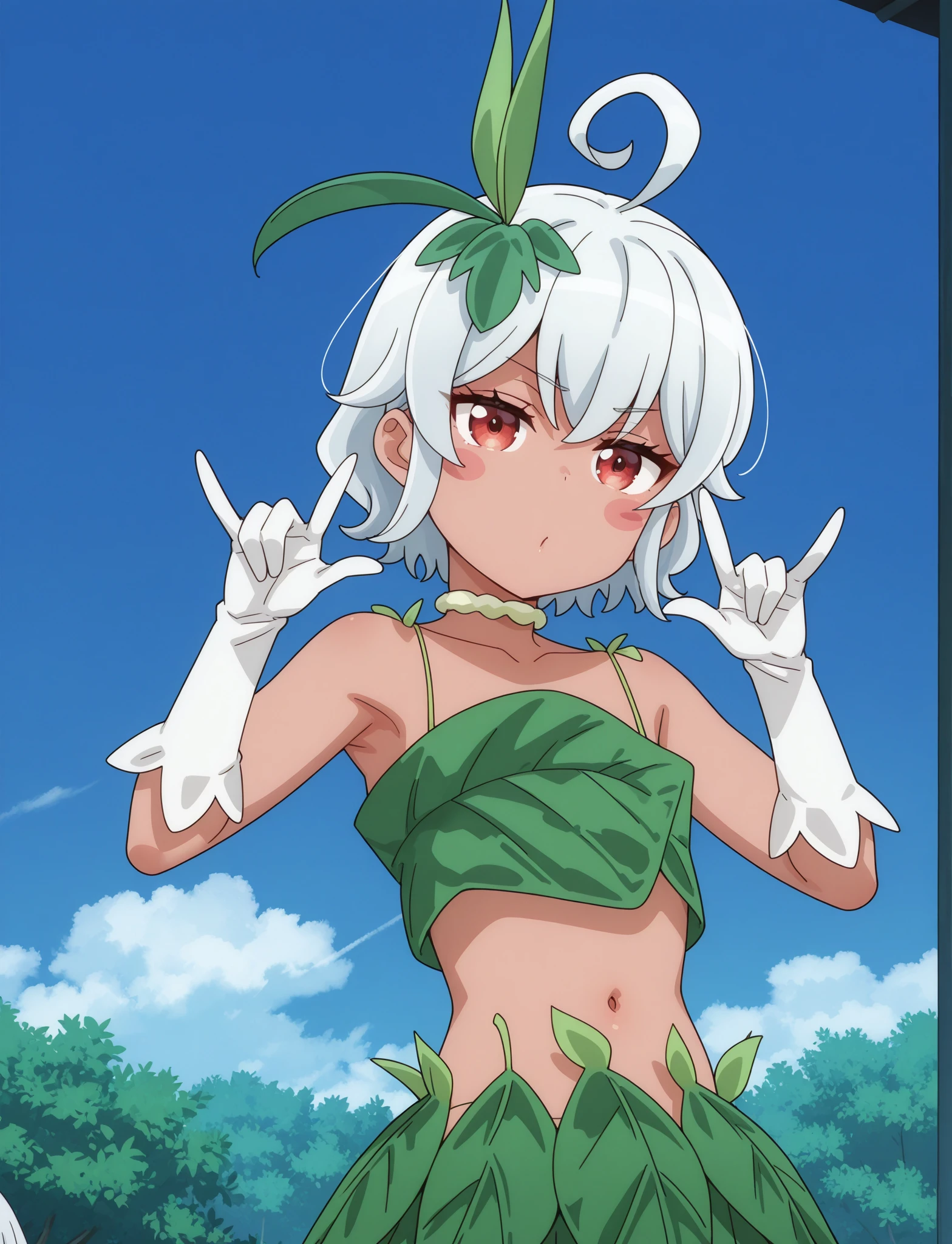 eris-leaf-outfit, leaf, white gloves, bare shoulders, navel, collarbone