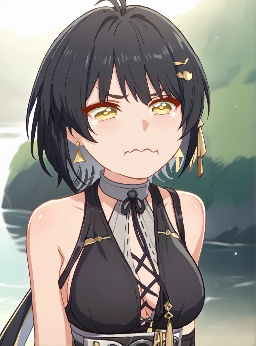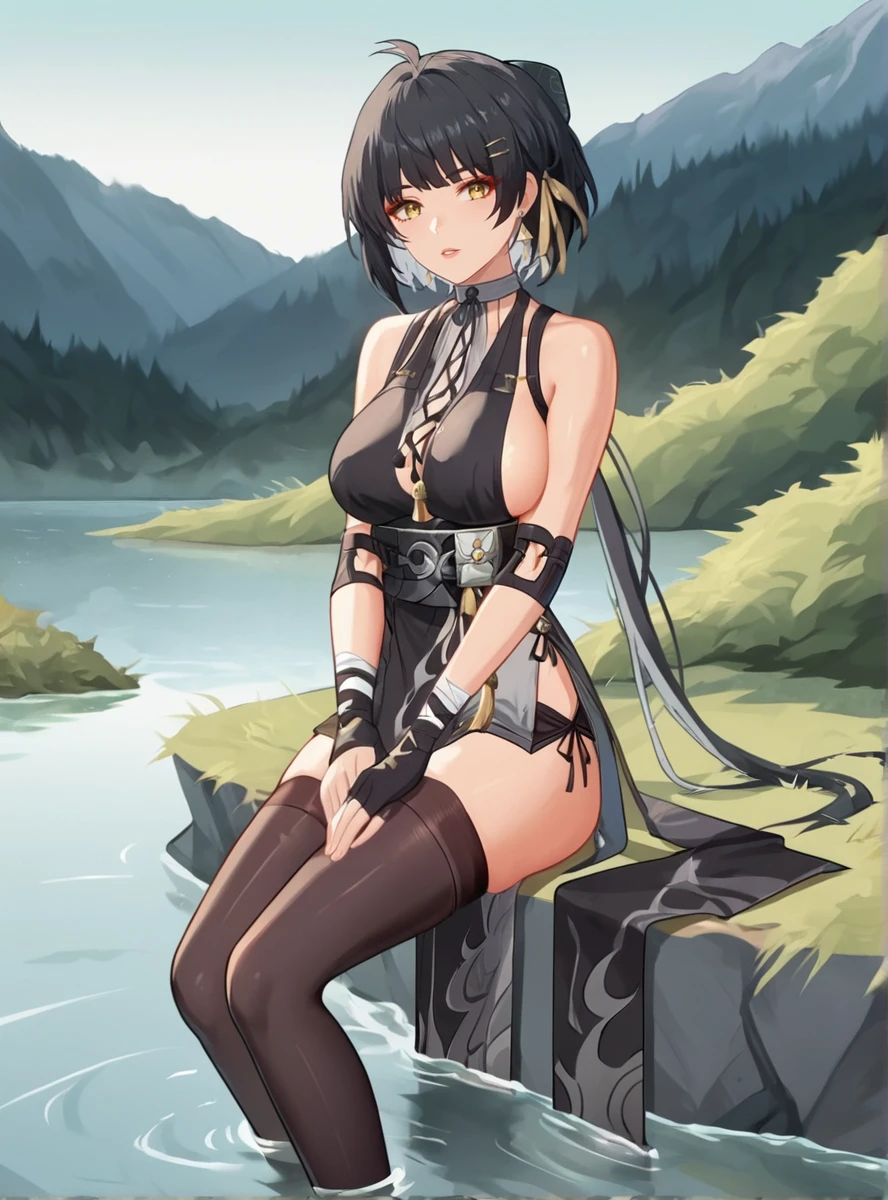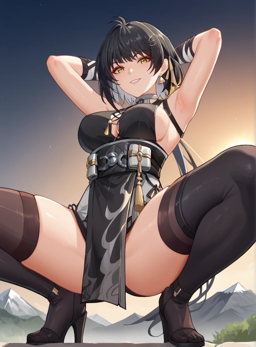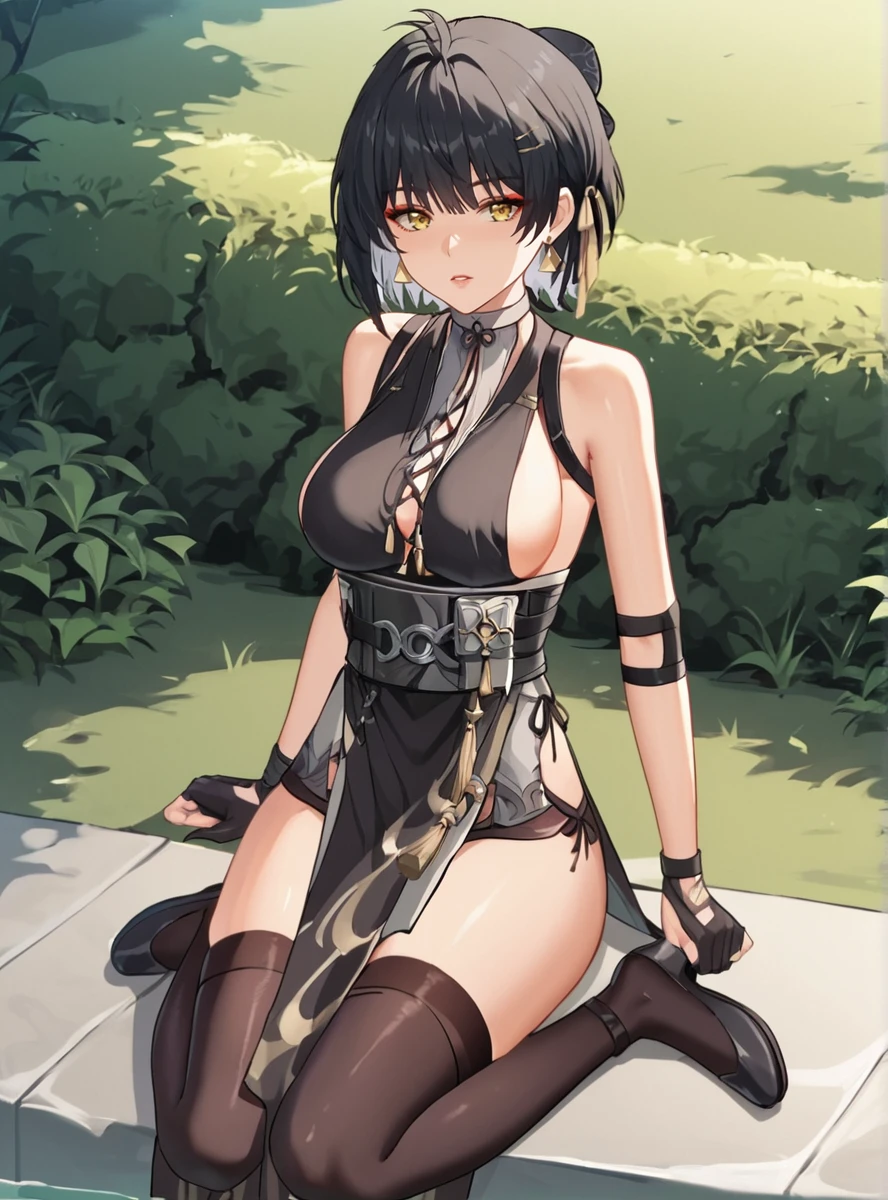 Prompts: black hair, gloves, bare shoulders, dress, black gloves, yellow eyes, hair ornament, thighhighs, short hair, long hair, fingerless gloves, jewelry, earrings, black footwear, black dress, sideboob, sleeveless,looking at viewer