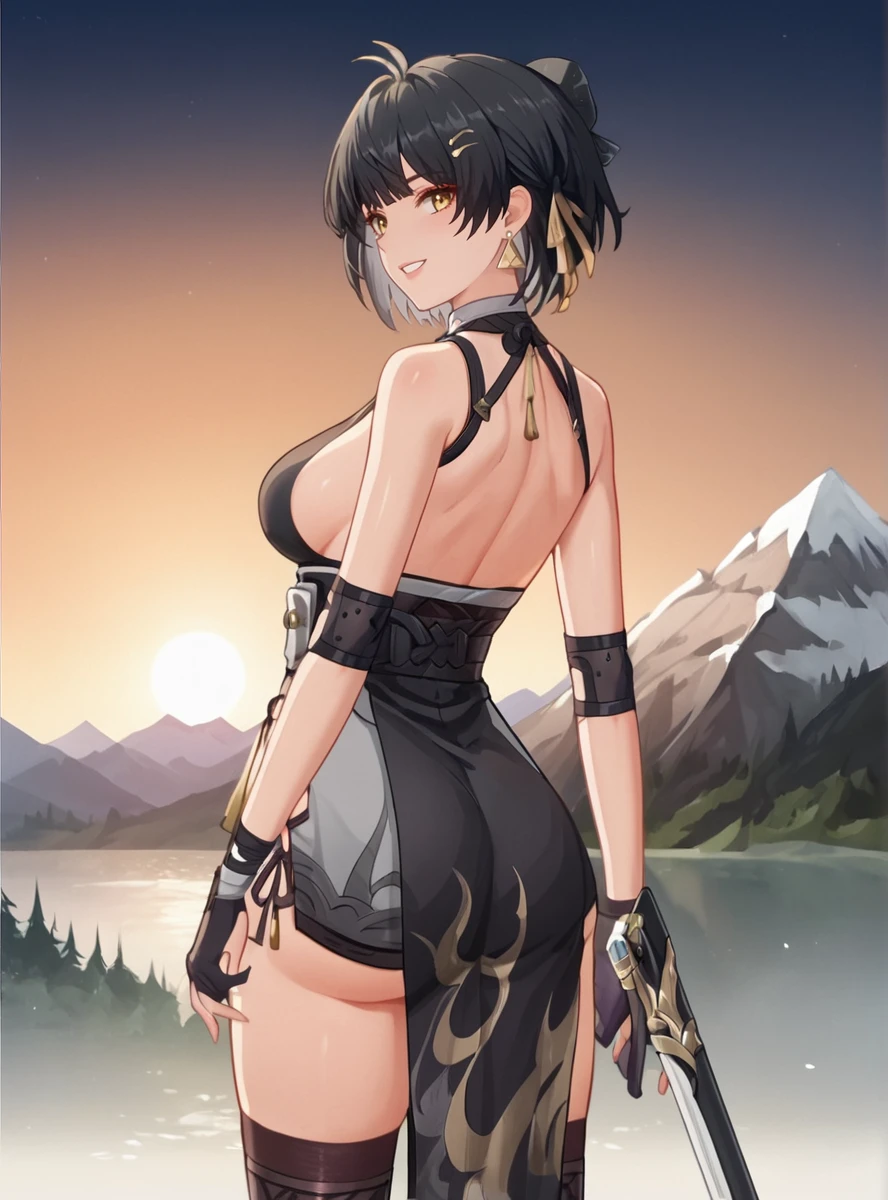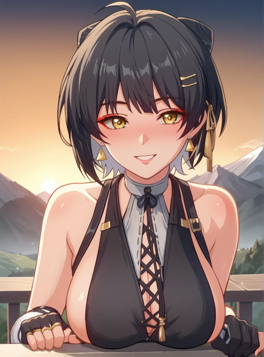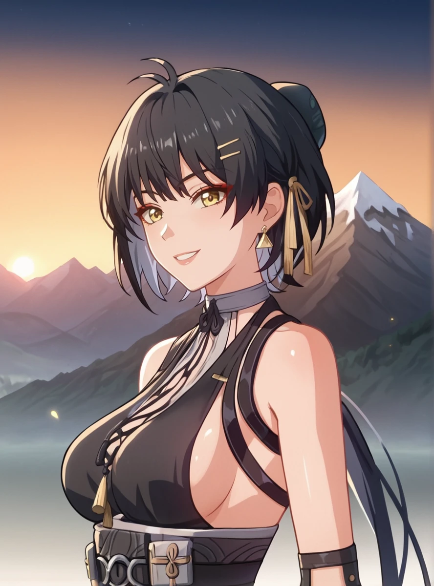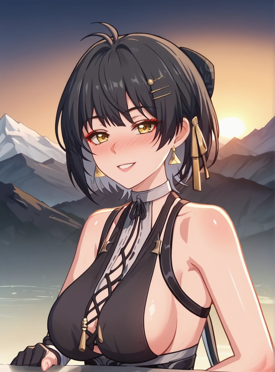 Prompts: black hair, gloves, bare shoulders, dress, black gloves, yellow eyes, hair ornament, thighhighs, short hair, long hair, fingerless gloves, jewelry, earrings, black footwear, black dress, sideboob, sleeveless,looking at viewer