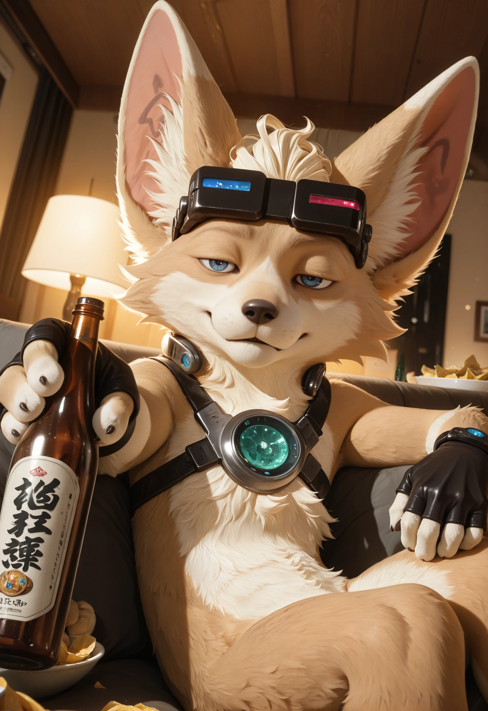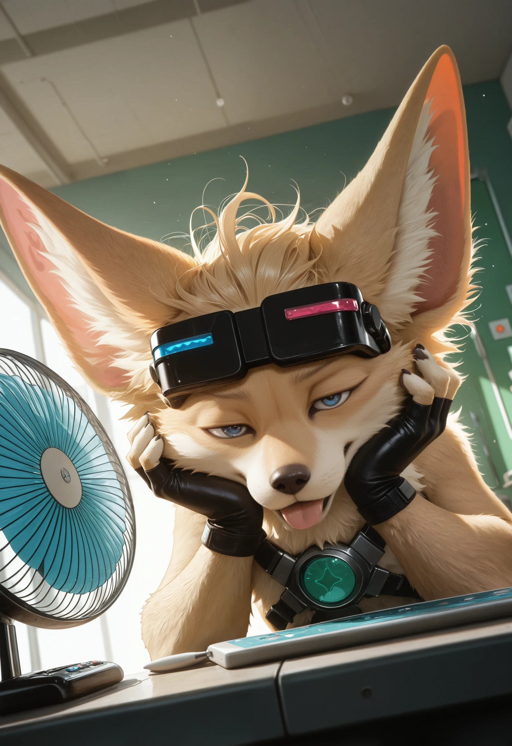 // Illustrious: ch1p_mlbb, mammal, fennec fox, furry, solo, goggles, 1boy, fingerless gloves, body fur, furry male, looking at viewer