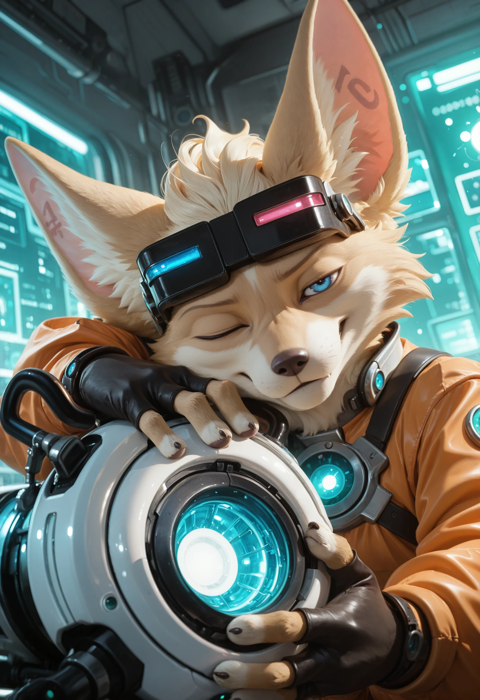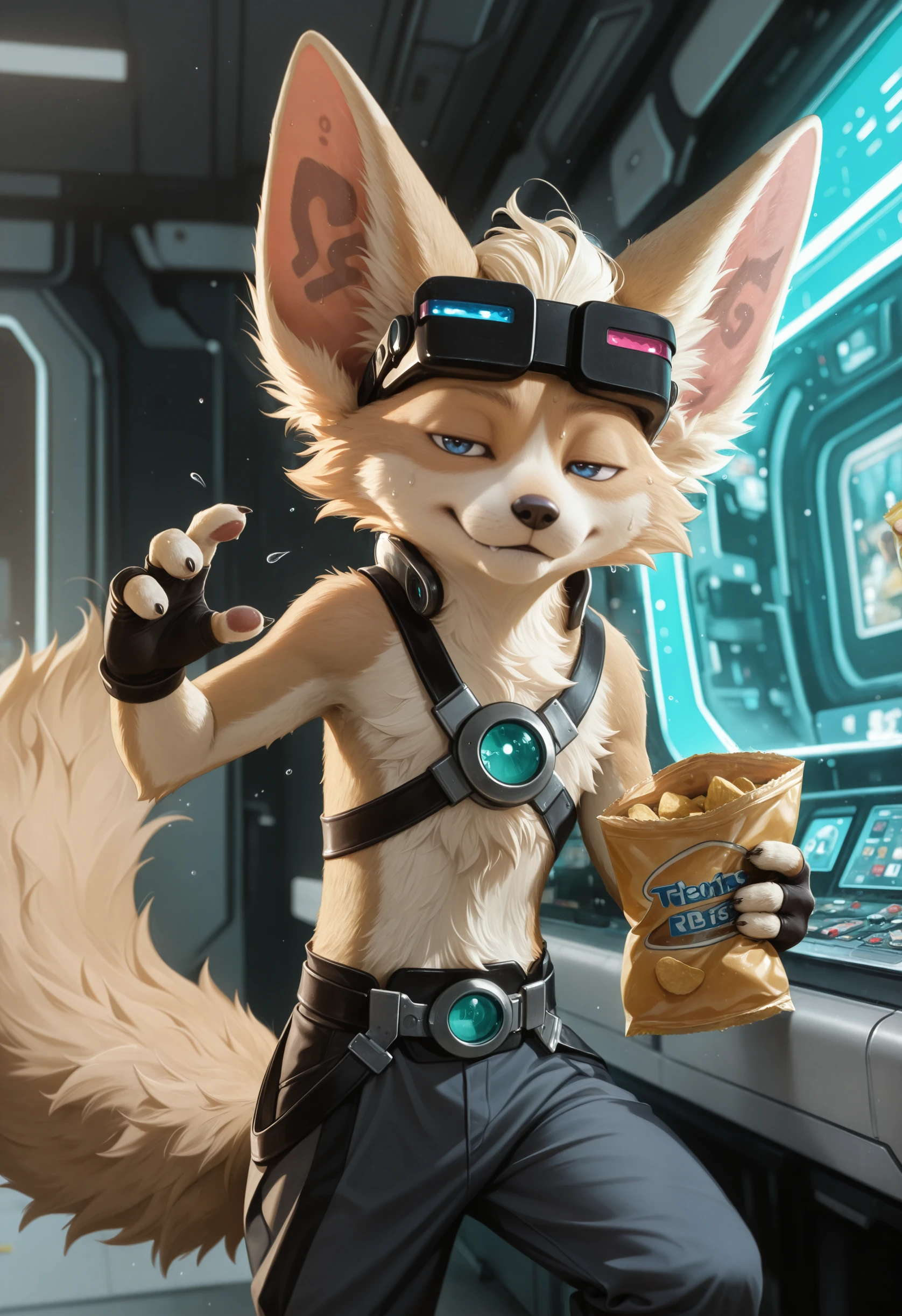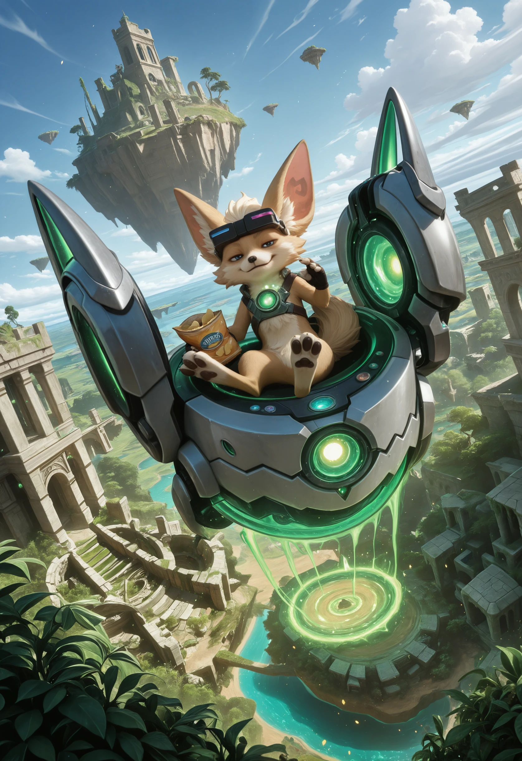 // Pony: chip the fox, fennec fox, 1boy, ocean, animal feet, tan fur, feet, goggles, body fur, fox ears, tail, 3 toes, chest tuft, cheek tuft, eyewear on head, blue eyes🚗 Additional tags / Дополнительные теги: hover pod, glowing details, dual thrusters, green glowing portal, chipmobile, vehicle