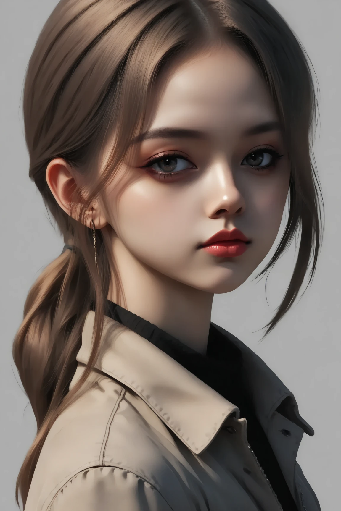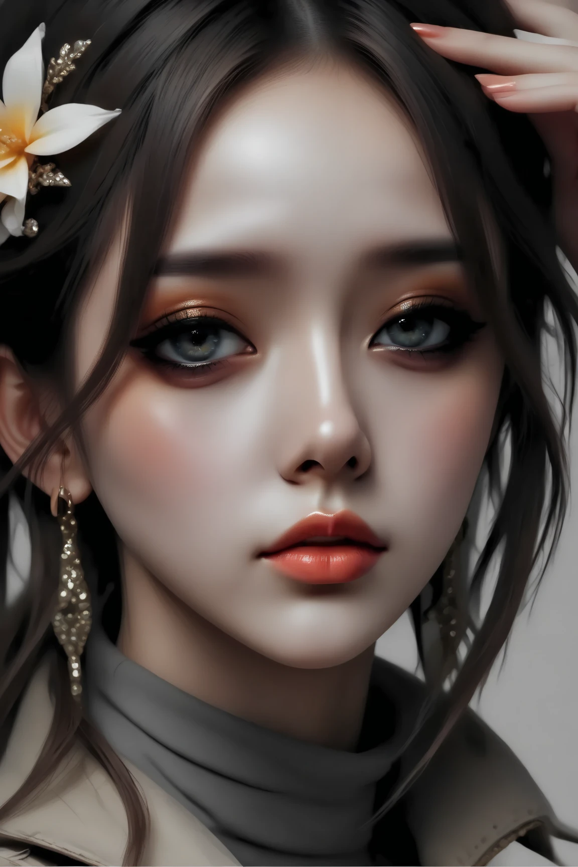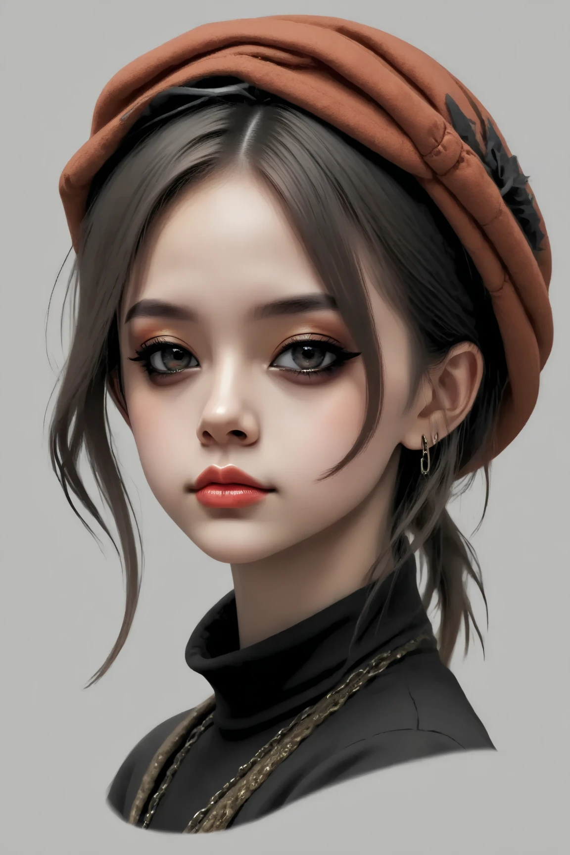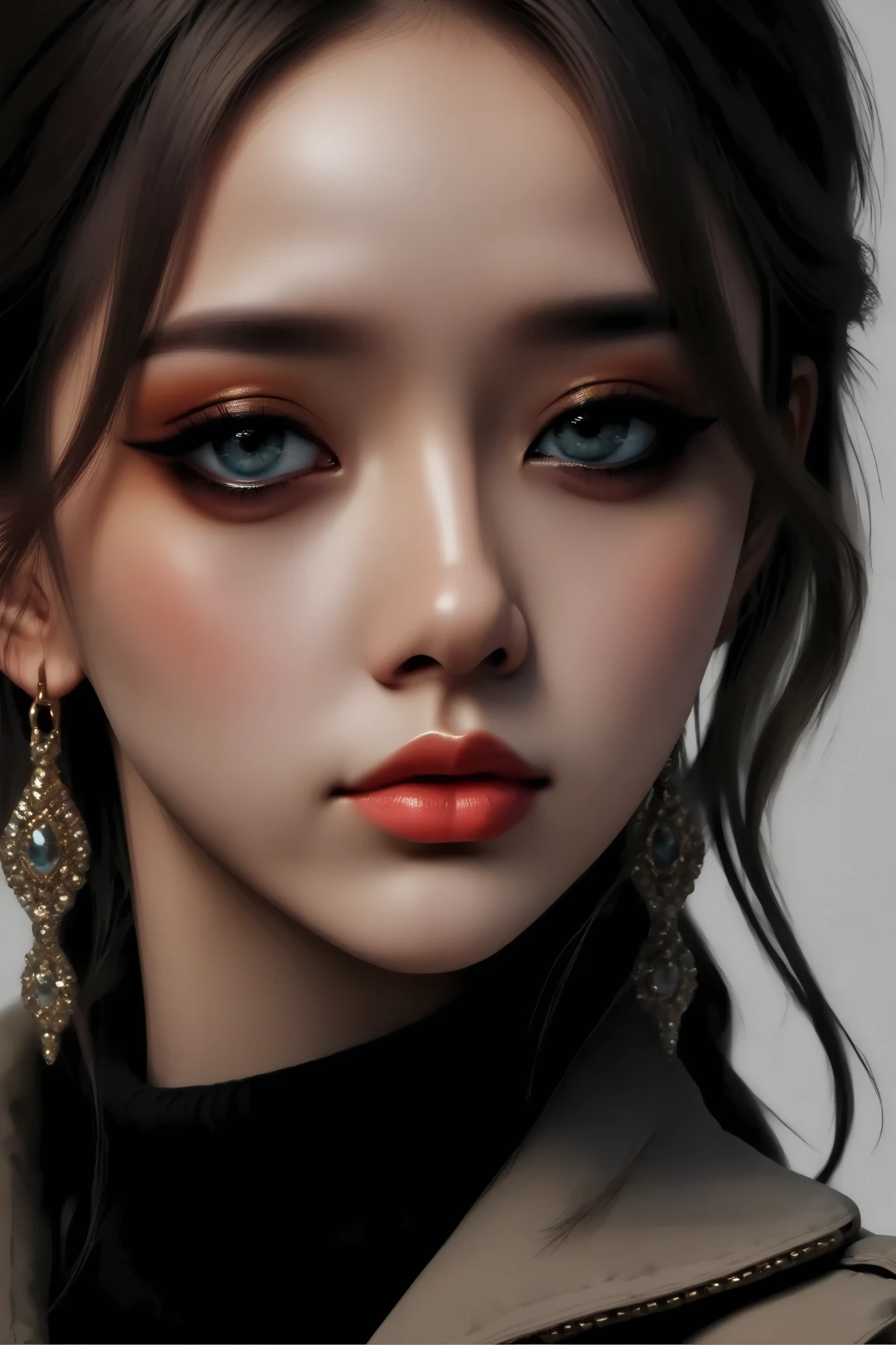 印象的な目つきの女性のクローズアップショットが捉えられています。彼女の黒髪はゆるやかなウェーブがかったスタイルで、背中に流れ落ち、複雑なデザインと真珠が付いた垂れ下がるイヤリングを着けています。彼女のメイクは大胆でドラマチックで、濃い赤のリップが彼女の青白い肌に映えます。彼女の目はスモーキーなアイメイクで強調され、眉は手入れされて埋められています。彼女は首の周りに繊細な真珠のチェーンが付いた黒いチョーカーを着けており、彼女のアンサンブルに優雅さを加えています。照明は柔らかく拡散しており、彼女の顔の輪郭とイヤリングの複雑なディテールを際立たせています。画像のスタイルはファンタジーやゴシック美学を彷彿とさせ、神秘と陰謀の感覚を呼び起こします。