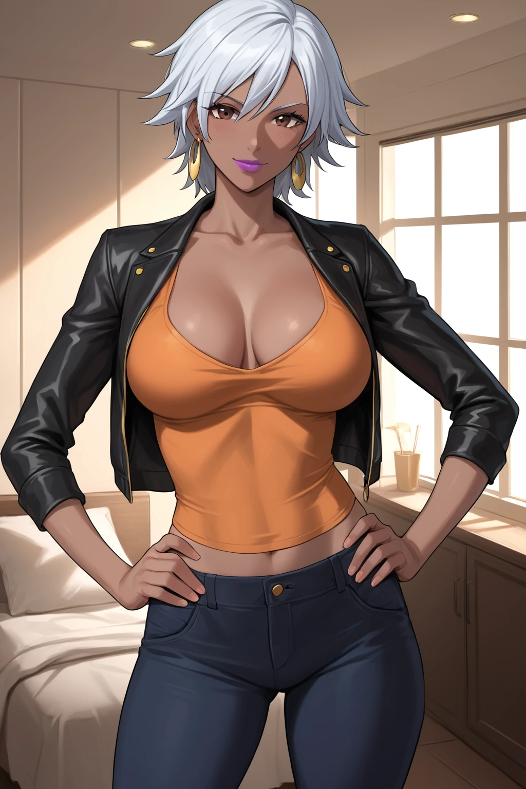 Casual Outfit: jewelry, earrings, jacket, cleavage, orange shirt, pants