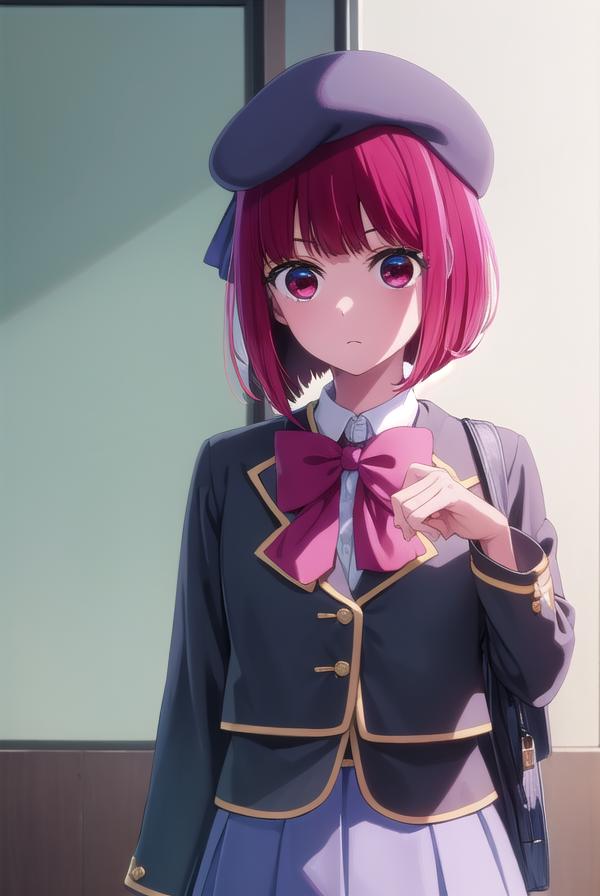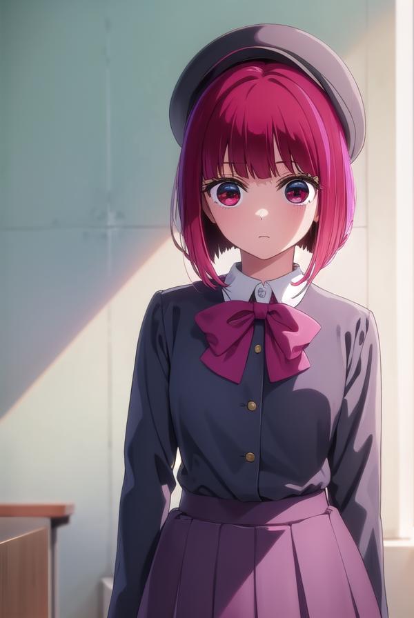 skirt, long sleeves, hat, bow, school uniform, jacket, pink bow, grey skirt, blue headwear,