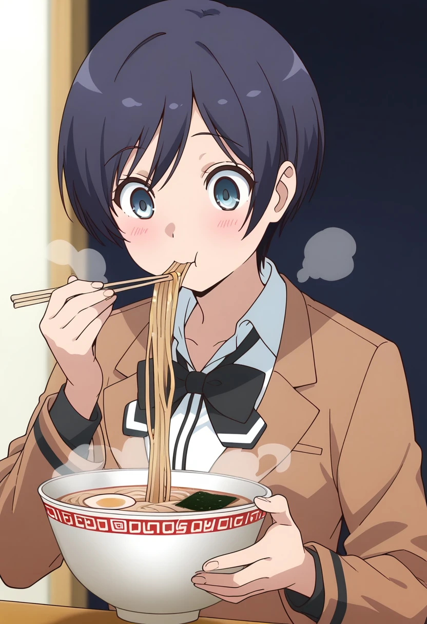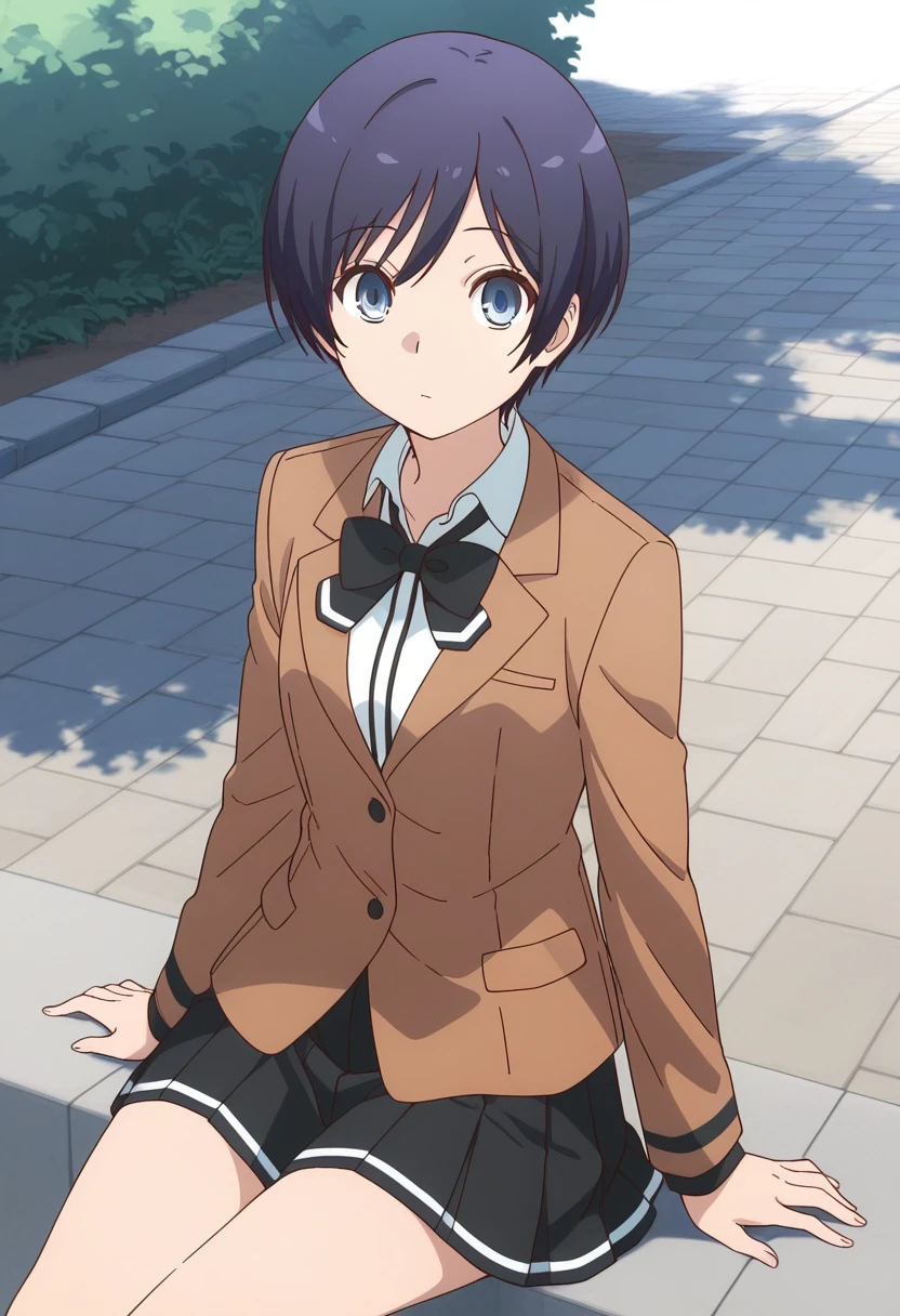 ・brown jacket, dress shirt, black bowtie, long sleeves, black skirt, pleated skirt, black socks, loafers