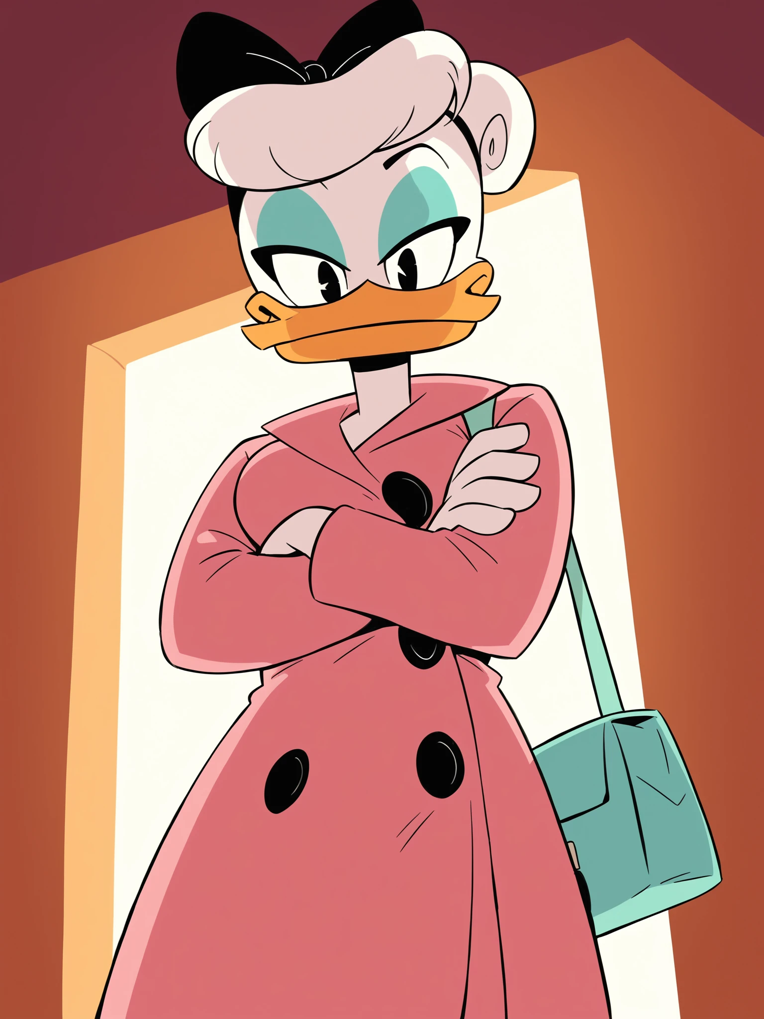 daisy duck, ducktales, beak, white skin, white hair, centered hair bow, headband, round bangs, hair bun, eyeliner, pink eyeshadow, teal eyeshadow, black eyes, orange legs, webbed feet, scut tail, short hairReinforcement SFW Tags: