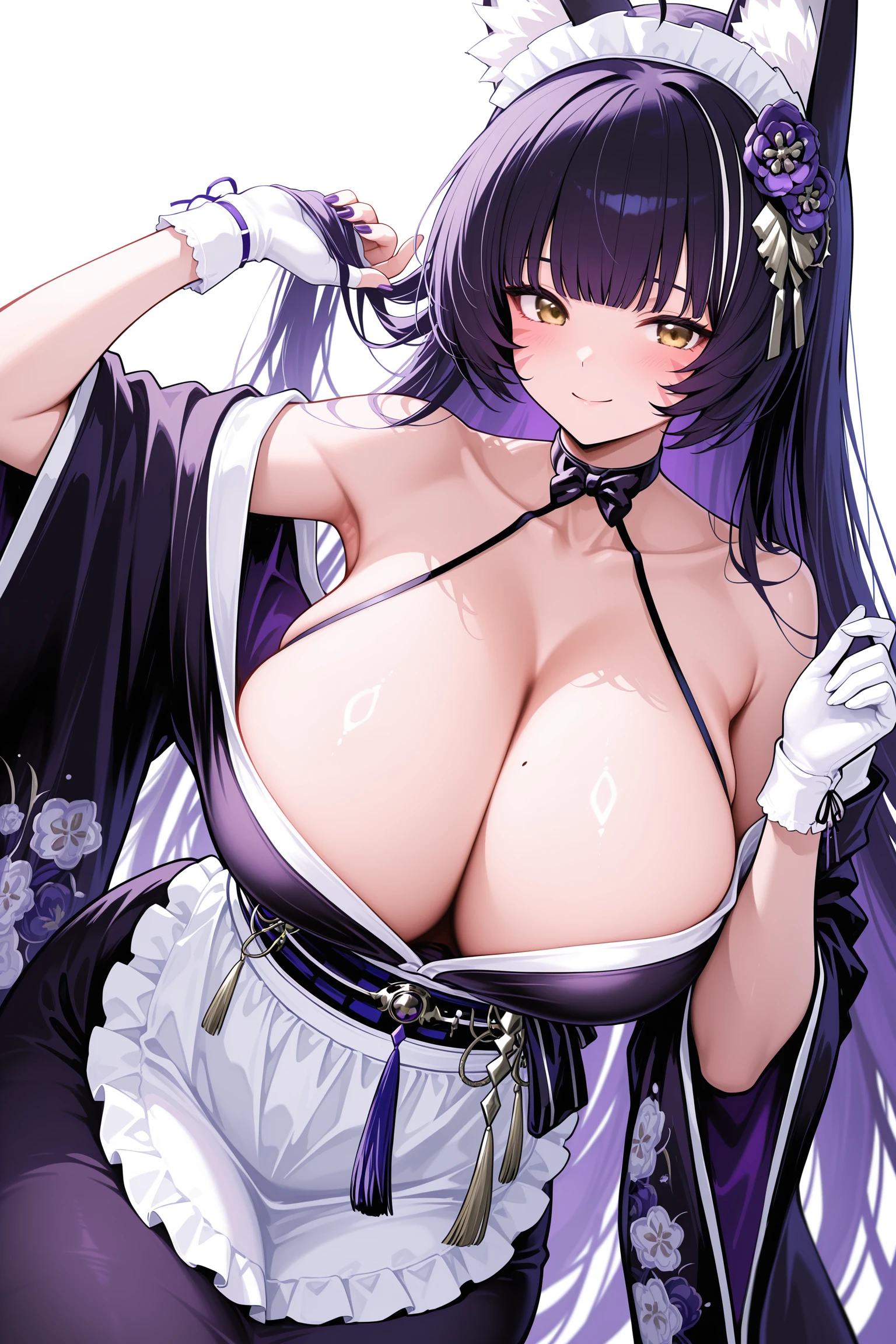 2. 和服(wa_maid):musashi_(violet_moonglow)_(azur_lane), wa_maid, print_kimono, frilled maid_apron, maid_headdress, 1girl, white_ear_fluff, whisker_markings, fox_ears, sidelocks, long_hair, blunt_bangs, black hair, purple hair, yellow eyes, breast, hair_flower, wide_sleeves, tassel, wrist_cuffs, halterneck, purple_flower, single_fingerless_glove, white gloves