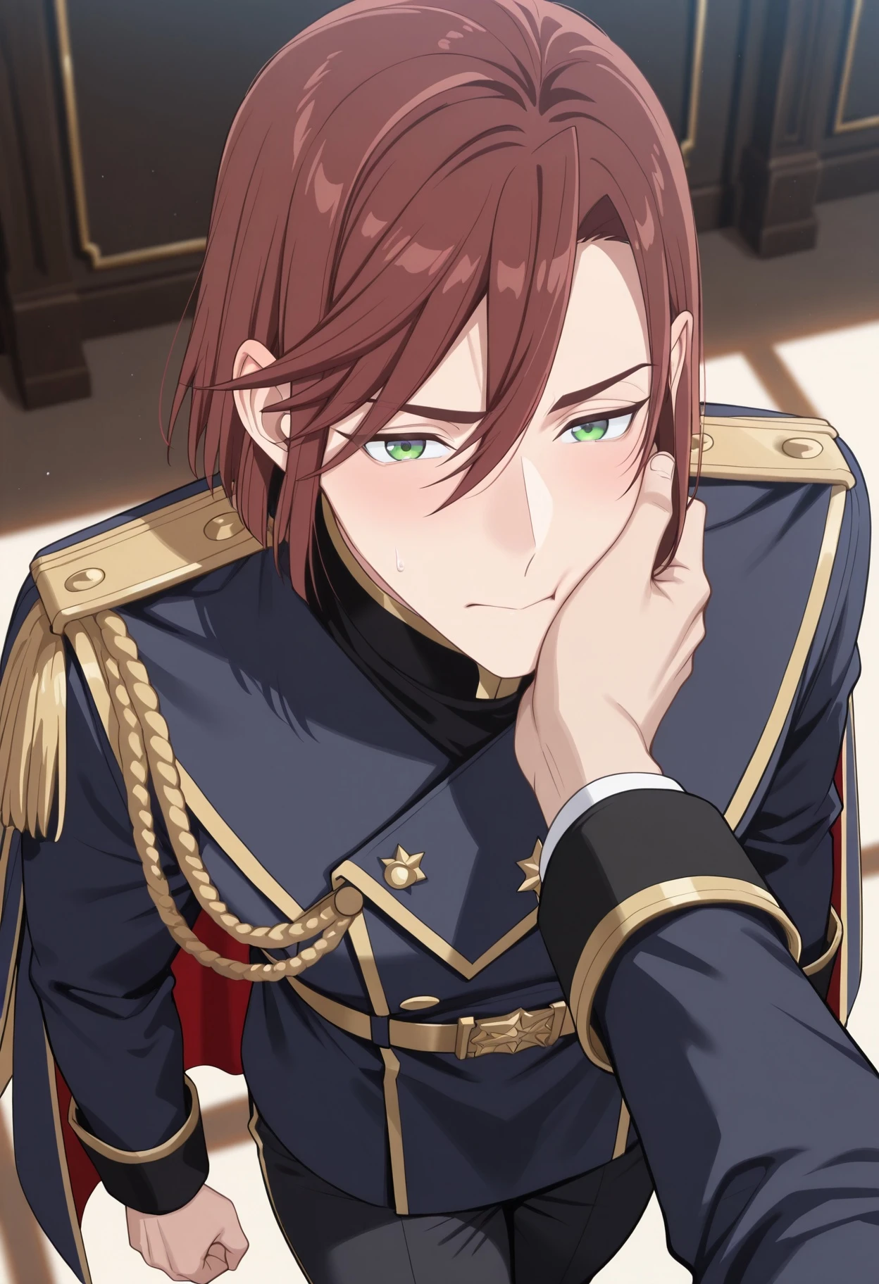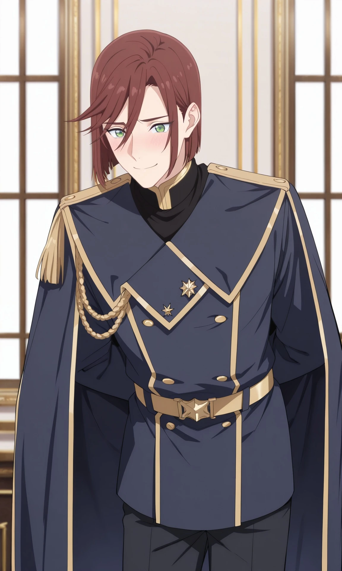 His outfit: military uniform,long tailored military coat with gold trim and buttons,navy coat,gold shoulder cord,small golden epaulette,stiff high collar,gold belt,long cape split in the middle,dark trousers,black boots,