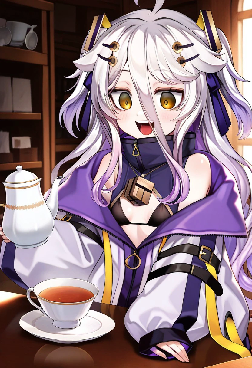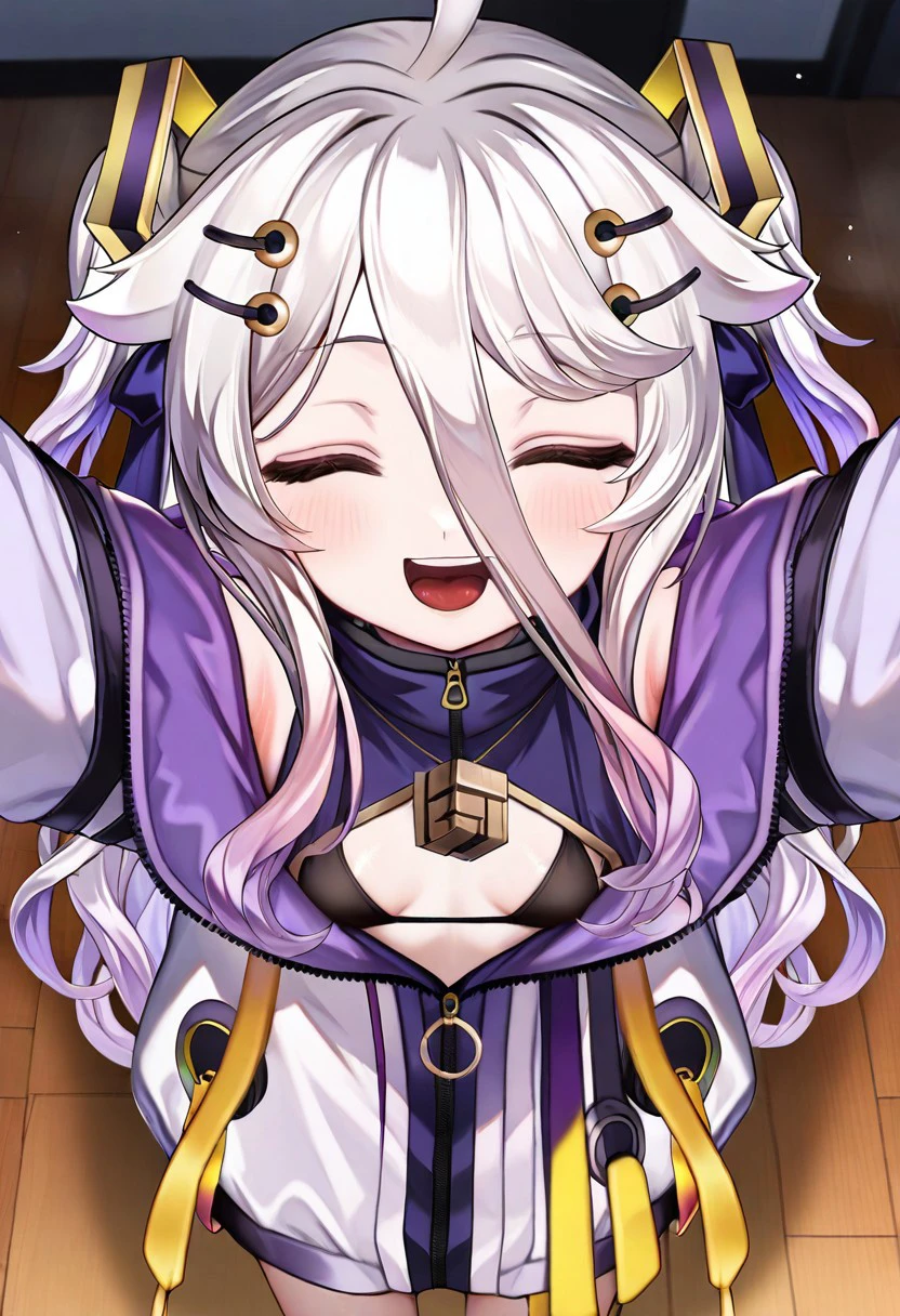 henya the genius, 1girl, yellow eyes, very long hair, white hair, purple hair, ahoge, hair between eyes, bangs, two side up, hair ornament, hair ribbon, hairclip, ribbon, small breasts, pendant, purple collar, jacket, white jacket, long sleeves, puffy sleeves, sleeves past wrists, clothing cutout, black bra, shoes, yellow footwear,