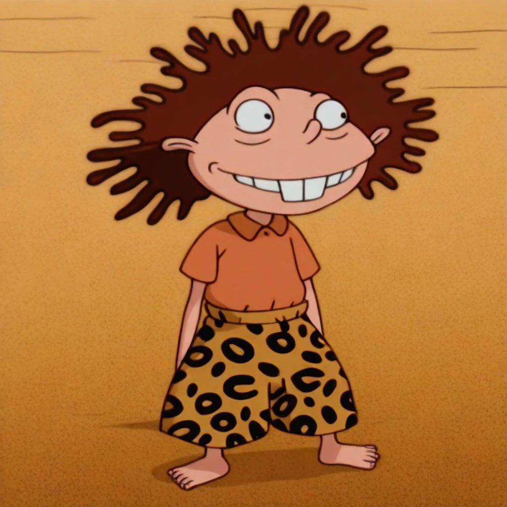 Donniethornberry, 1boy, child, shirtless, fair skin, dark brown hair, donnie hair style source cartoon, show accurate, leopard spotted shorts,