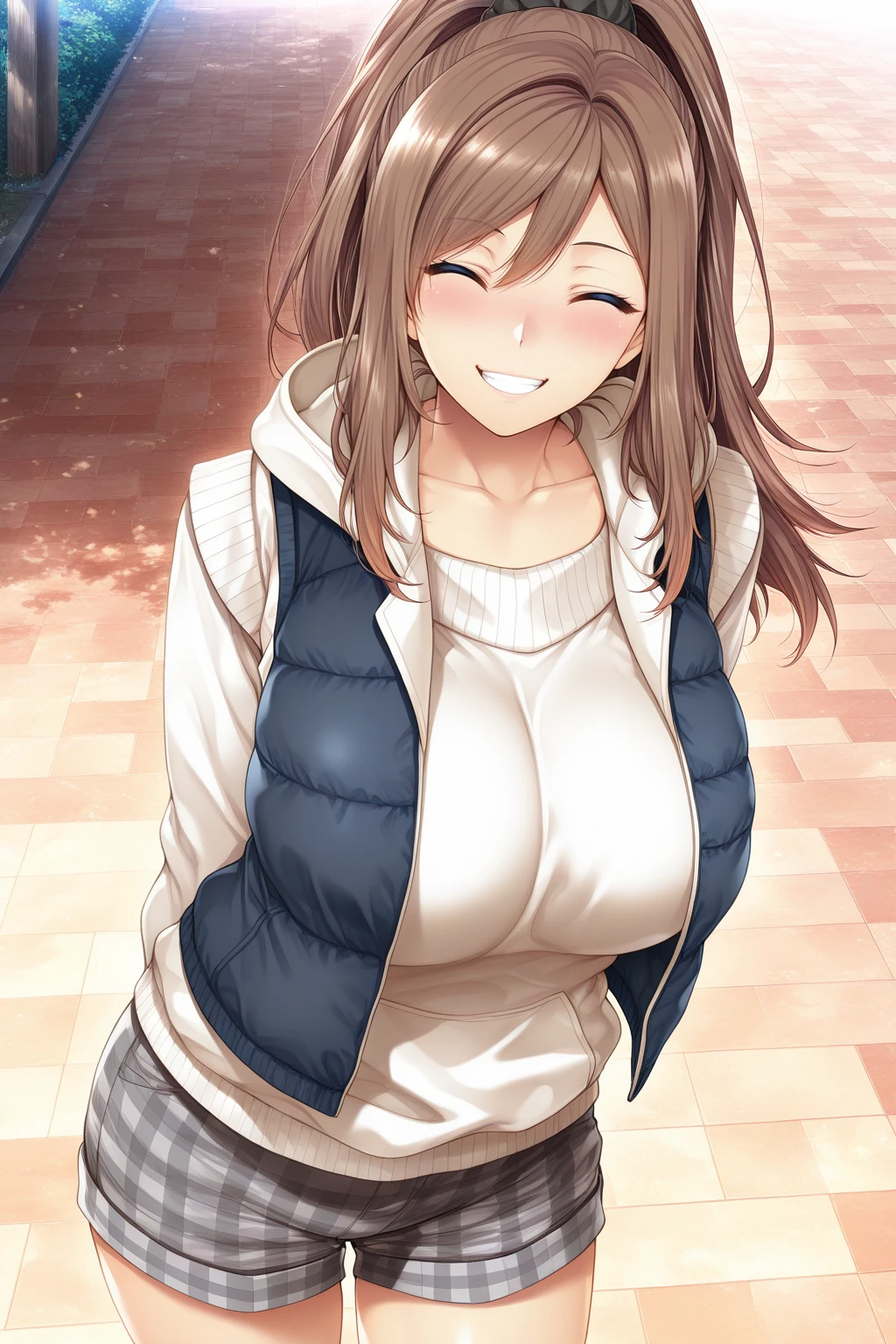 izyi likexlove,game cg,Totsukawa Hikaru,1girl,solo,brown hair,ponytail,black scrunchie,hair ornament,long hair,blue eyes,,hooded vest,open vest,white lone sleeves sweater,lone sleeves,shorts,plaid shorts,plaid,sneakers,