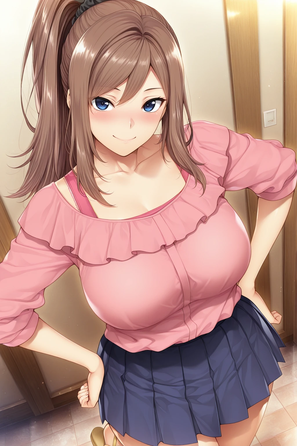 izyi likexlove,game cg,Totsukawa Hikaru,1girl,solo,brown hair,ponytail,black scrunchie,hair ornament,long hair,blue eyes,,collarbone,pink shirt, strap,blue skirt,pleated skirt,sandals,