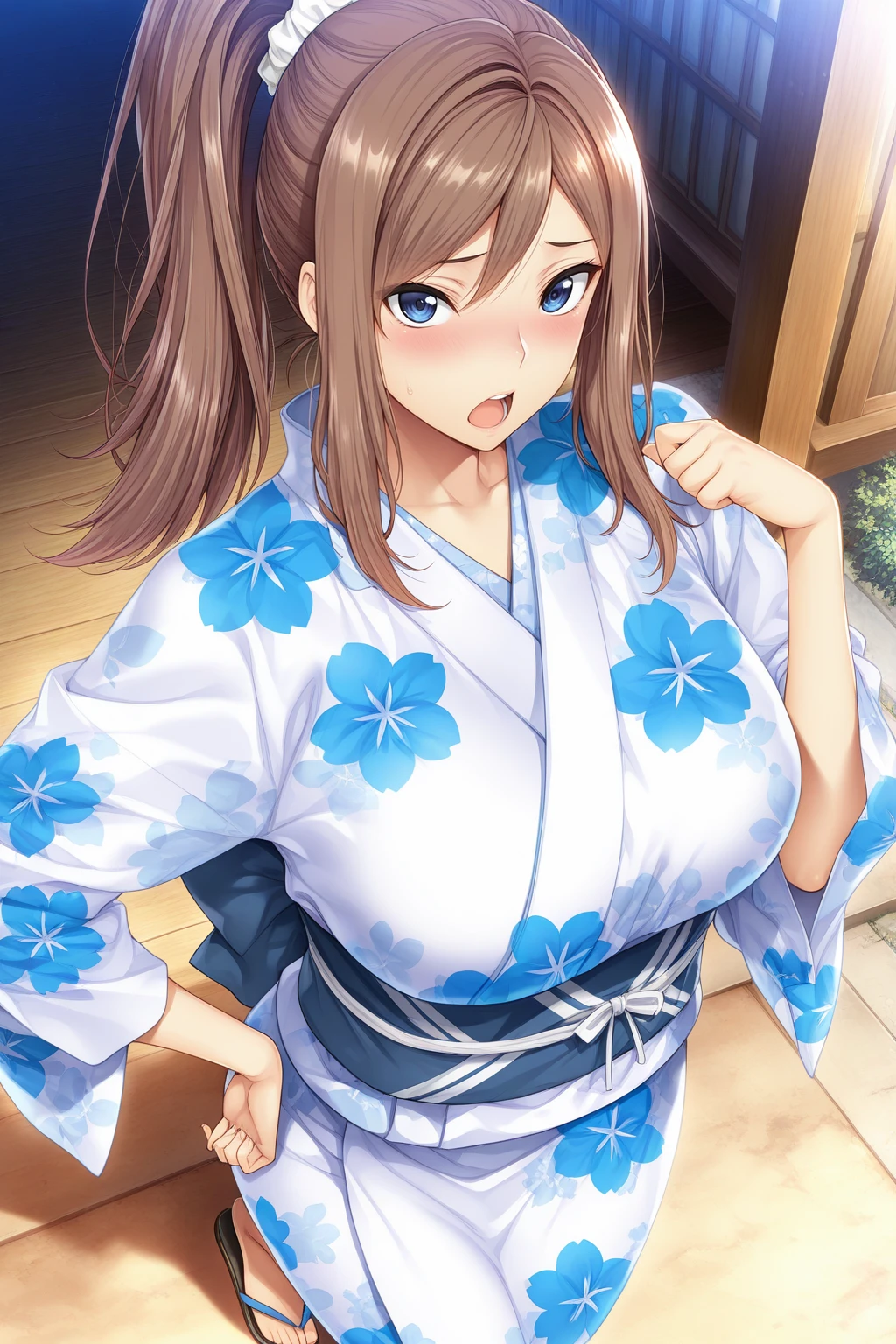 izyi likexlove,game cg,Totsukawa Hikaru,1girl,solo,brown hair,ponytail,white scrunchie,hair ornament,long hair,blue eyes,,japanese clothes,print kimono,yukata,long sleeves,sash,floral print,blue print obi,flip-flops,
