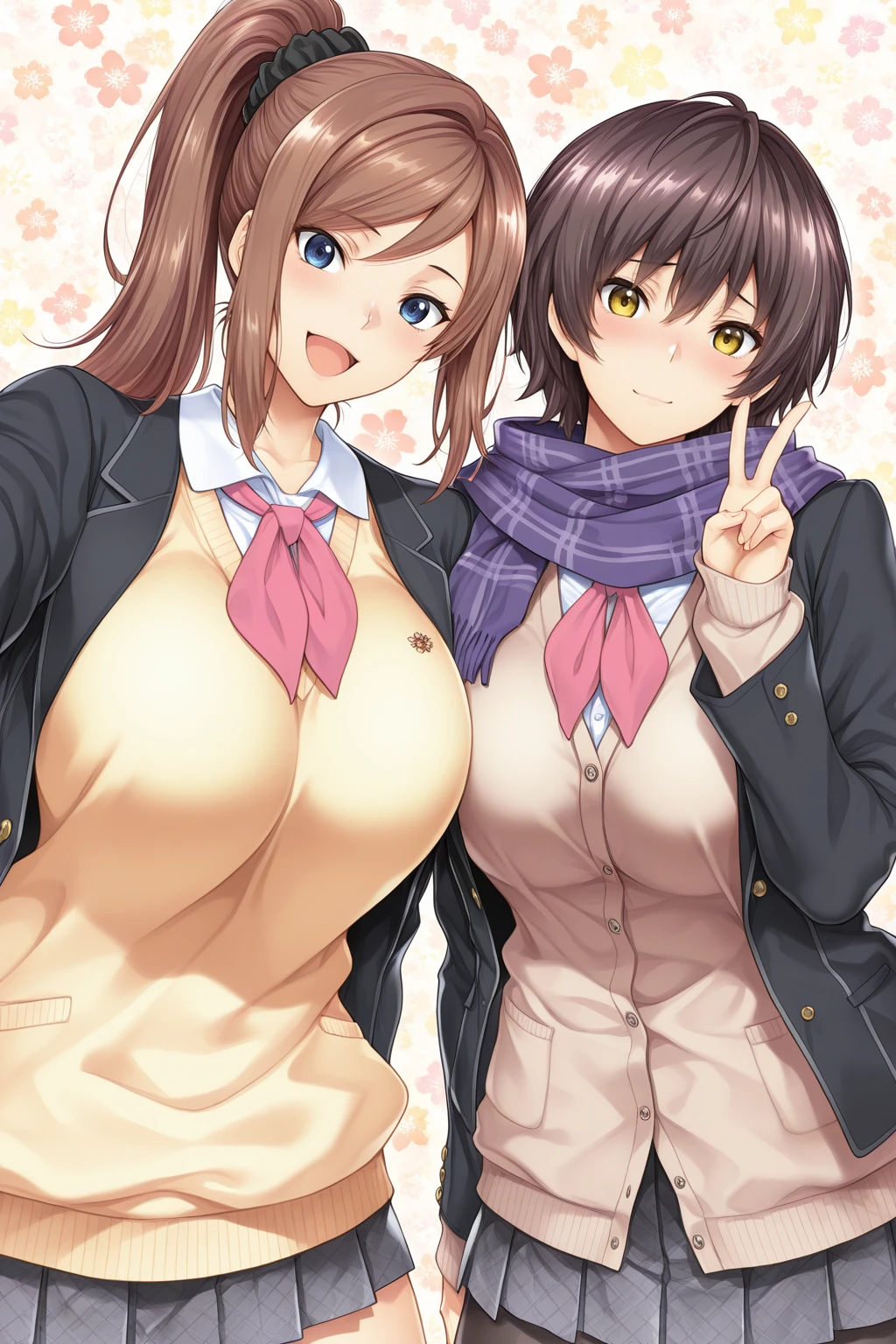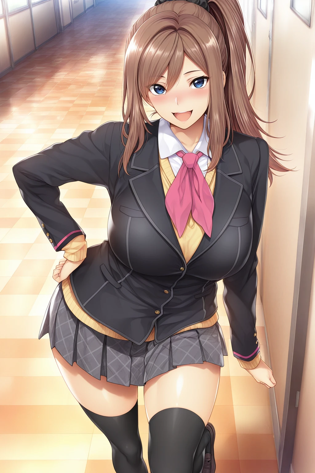 izyi likexlove,game cg,Totsukawa Hikaru,1girl,solo,brown hair,ponytail,black scrunchie,hair ornament,long hair,blue eyes,,school uniform,black jacket,long sleeves,pink neckerchief,yellow sweater,collared shirt,plaid skirt,,grey skirt,black thighhighs,loafers,