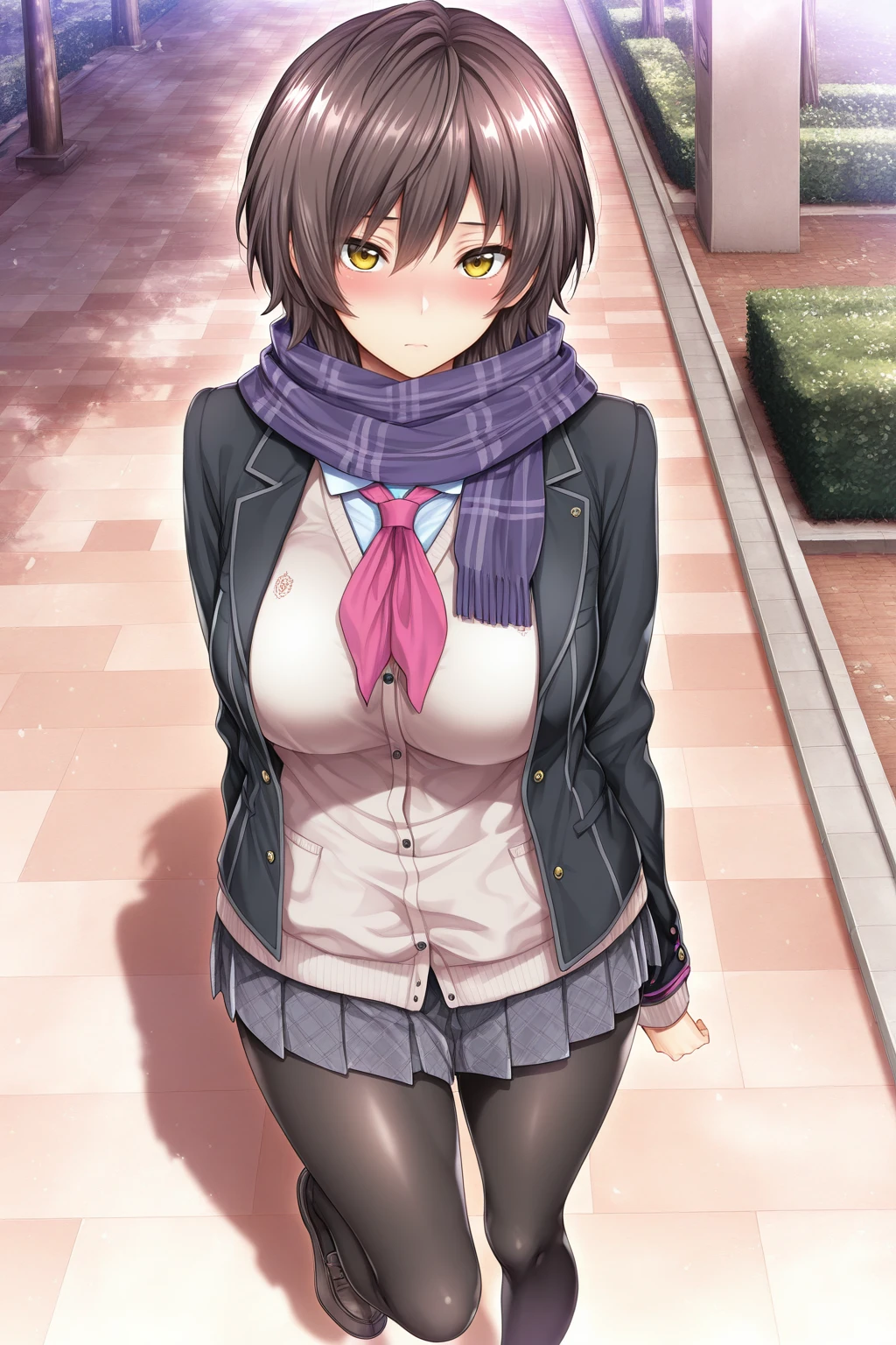 izyi likexlove,game cg,Irokawa Suzune,1girl,solo,short hair,brown hair,yellow eyes,,purple scarf,plaid scarf,school uniform,black jacket,,long sleeves,pink neckerchief,cardigan,shirt,pleated skirt,plaid,grey skirt,black pantyhose,loafers,