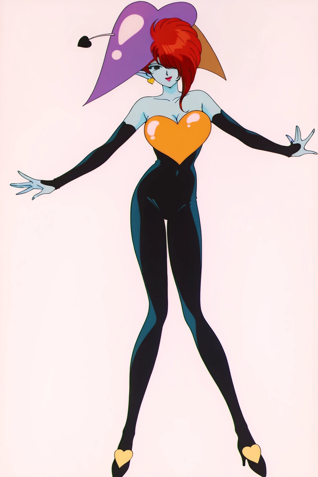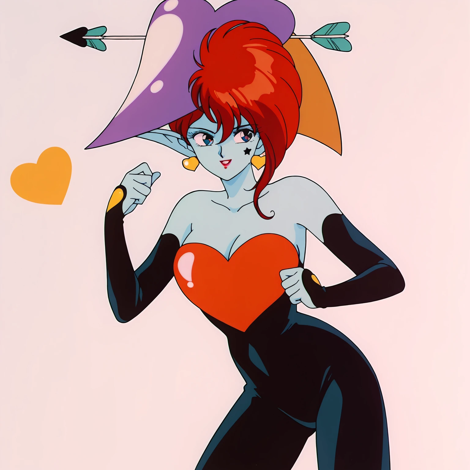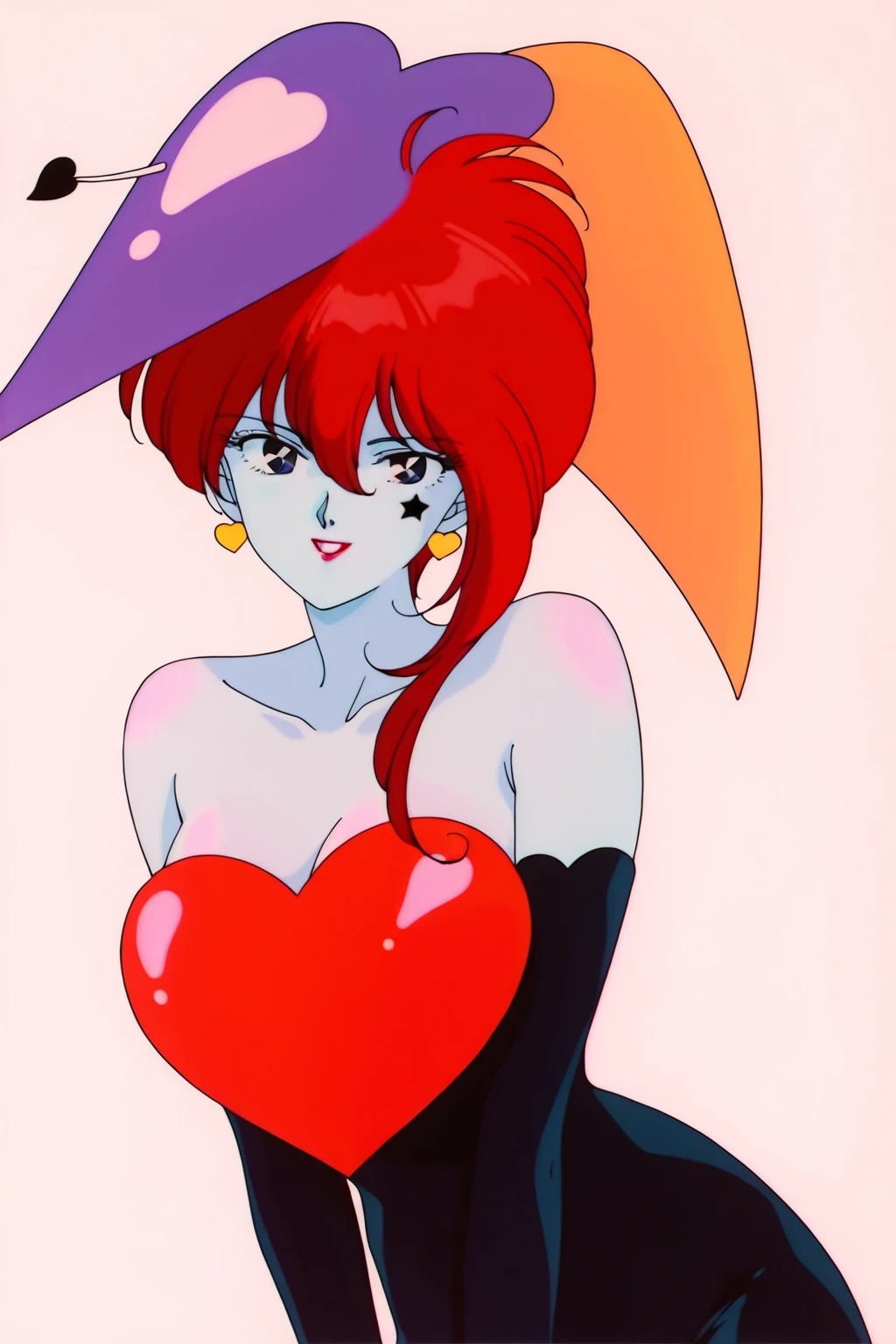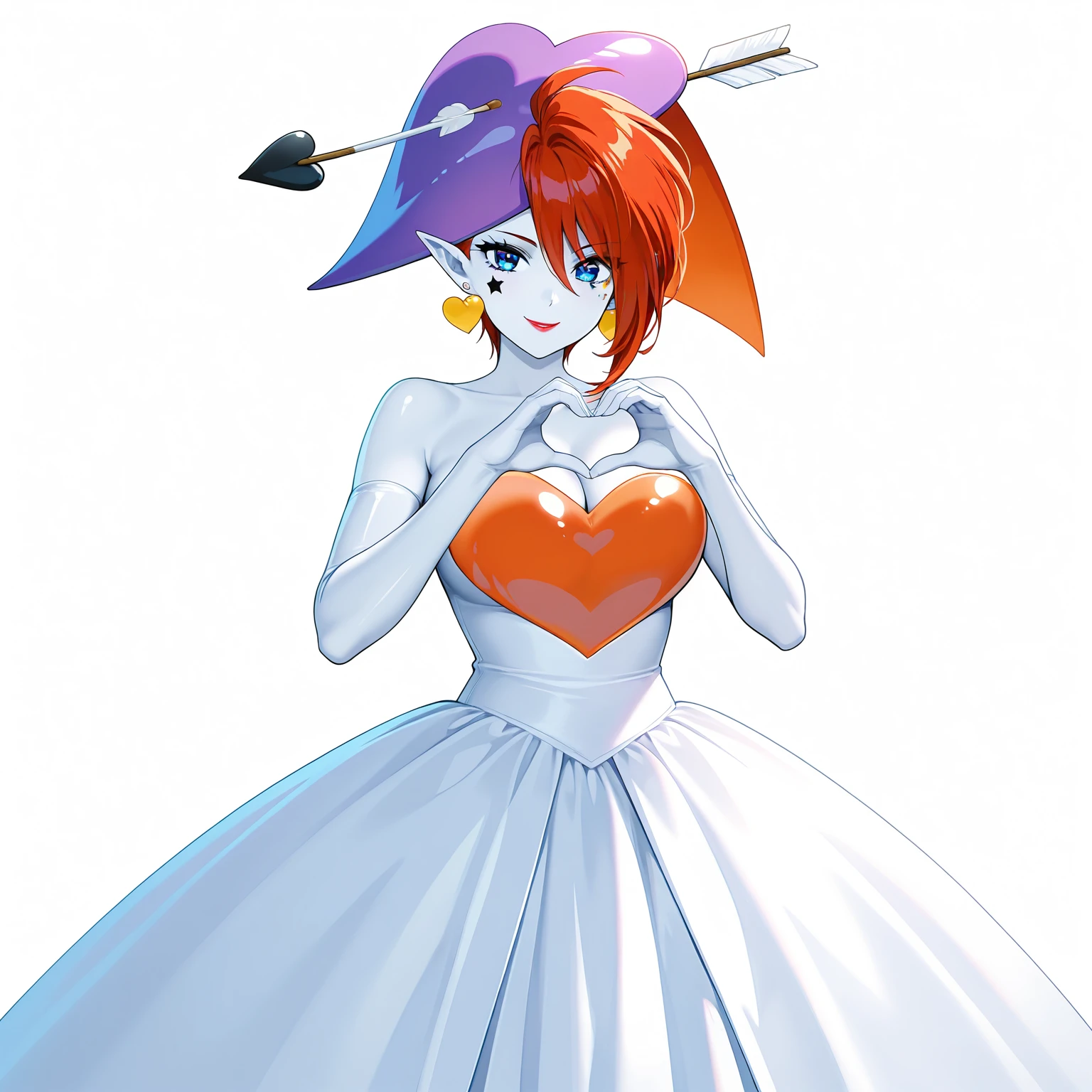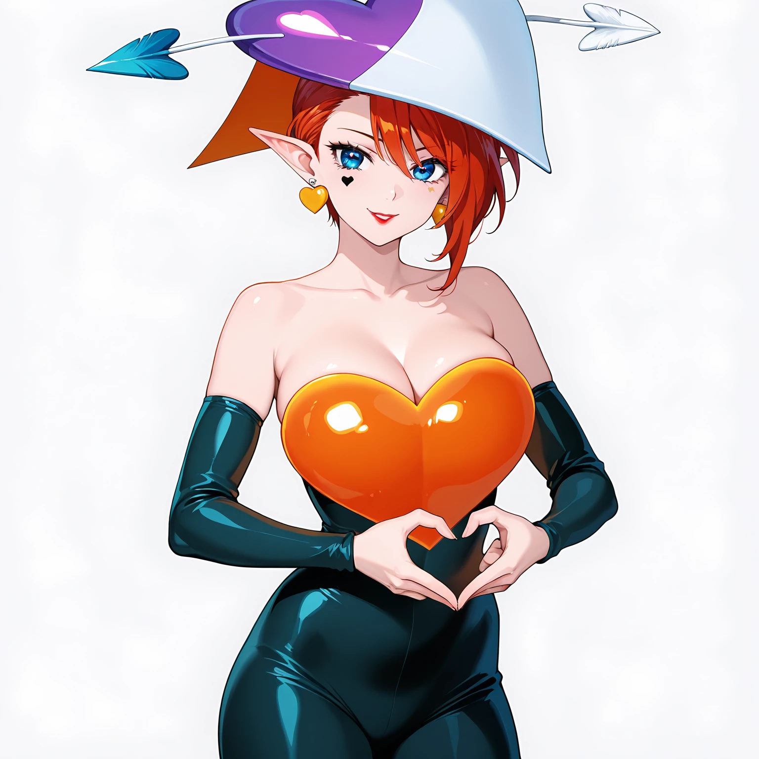 die-heart, 1girl, solo, , short hair, , simple background, gloves, cleavage, shoulders, blue eyes, jewelry, purple and yellow heart shaped headwear with arrow shot through, white skin, standing, orange heart, earrings, pointy ears, , black , heart earrings, detached sleeves, red hair,star mark under left eye, smile, lipstick,