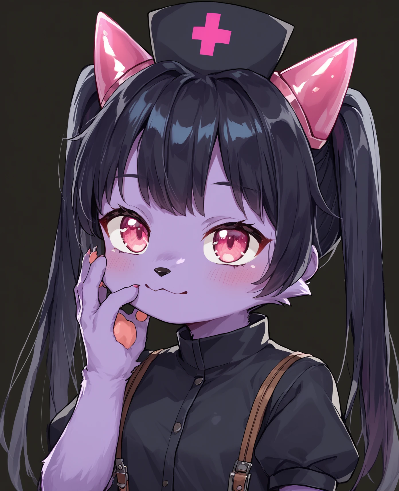 chrome(mon-musu quest!), twintails, horns, purple skin, nurse clothing, puffy sleeves, striped legwear, midriff, suspenders,