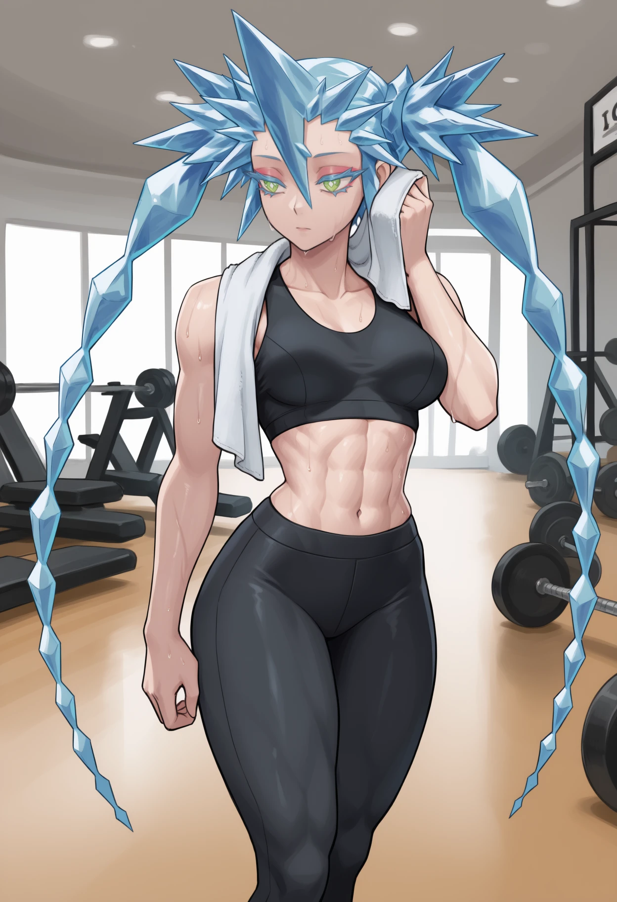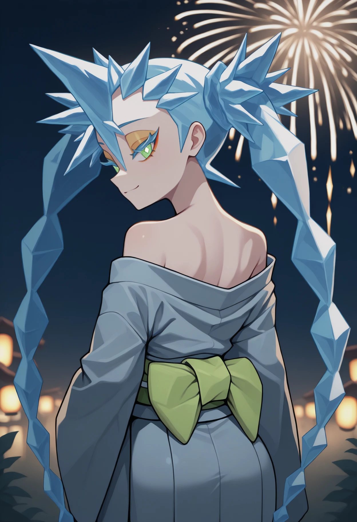 Trigger + Appearance: ic3m1ku, eyeshadow, long hair, blue hair, crystal hair, hair between eyes, spiked hair, twintails, green eyes, diamond-shaped pupils, white pupils, colored eyelashes