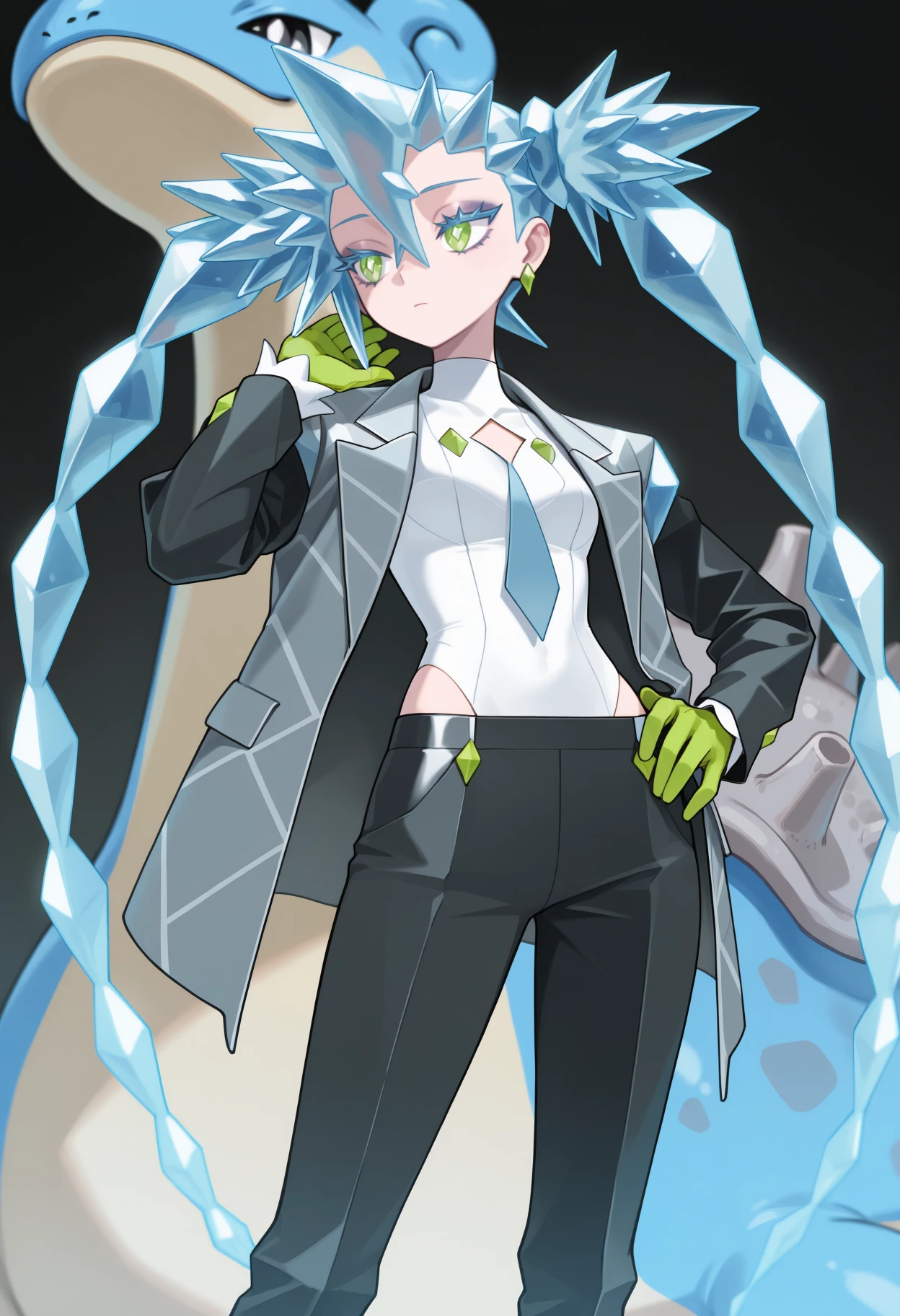 Default Outfit: grey jacket, open jacket, long sleeves, black sleeves, white leotard, highleg leotard, diamond cutout, blue necktie, green gloves, black pants, earrings
