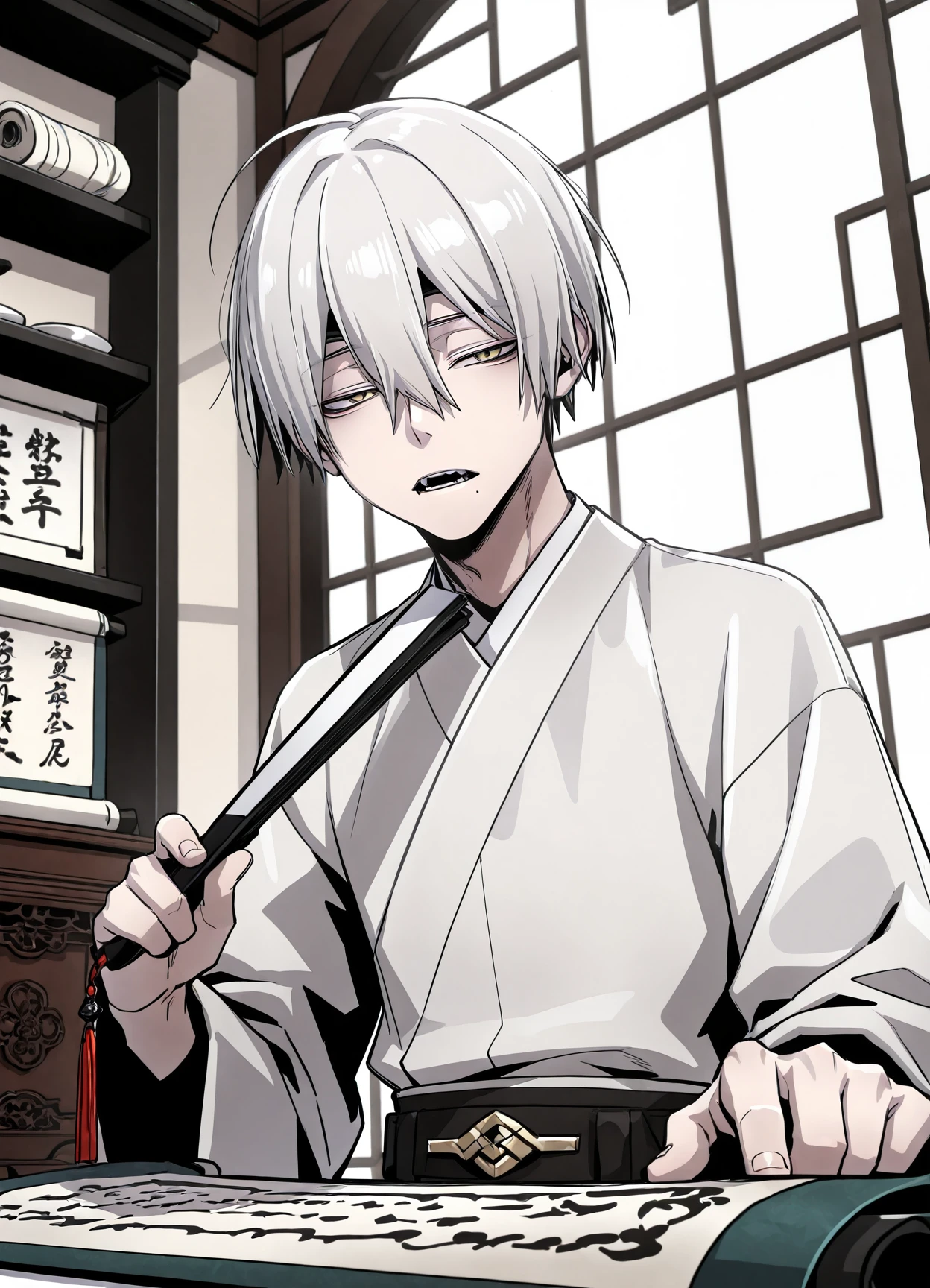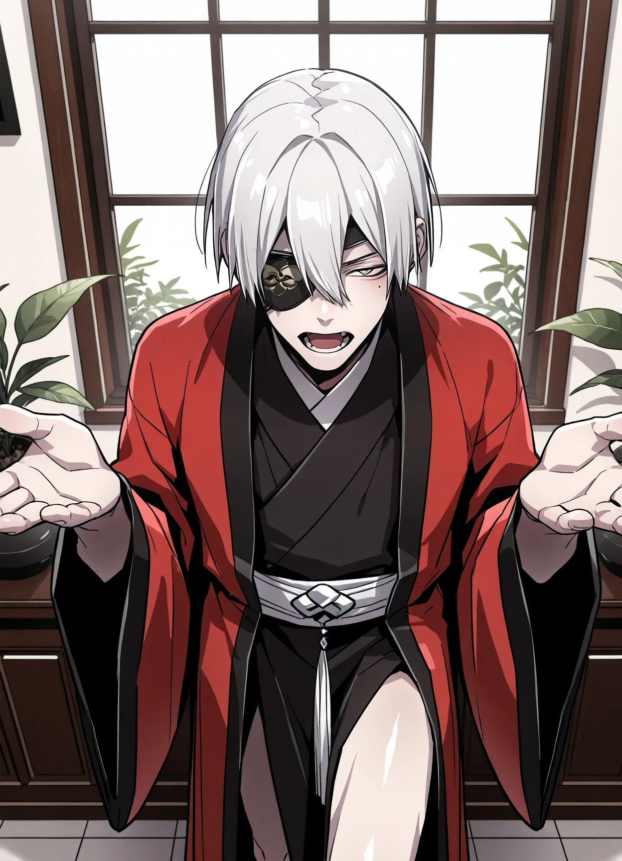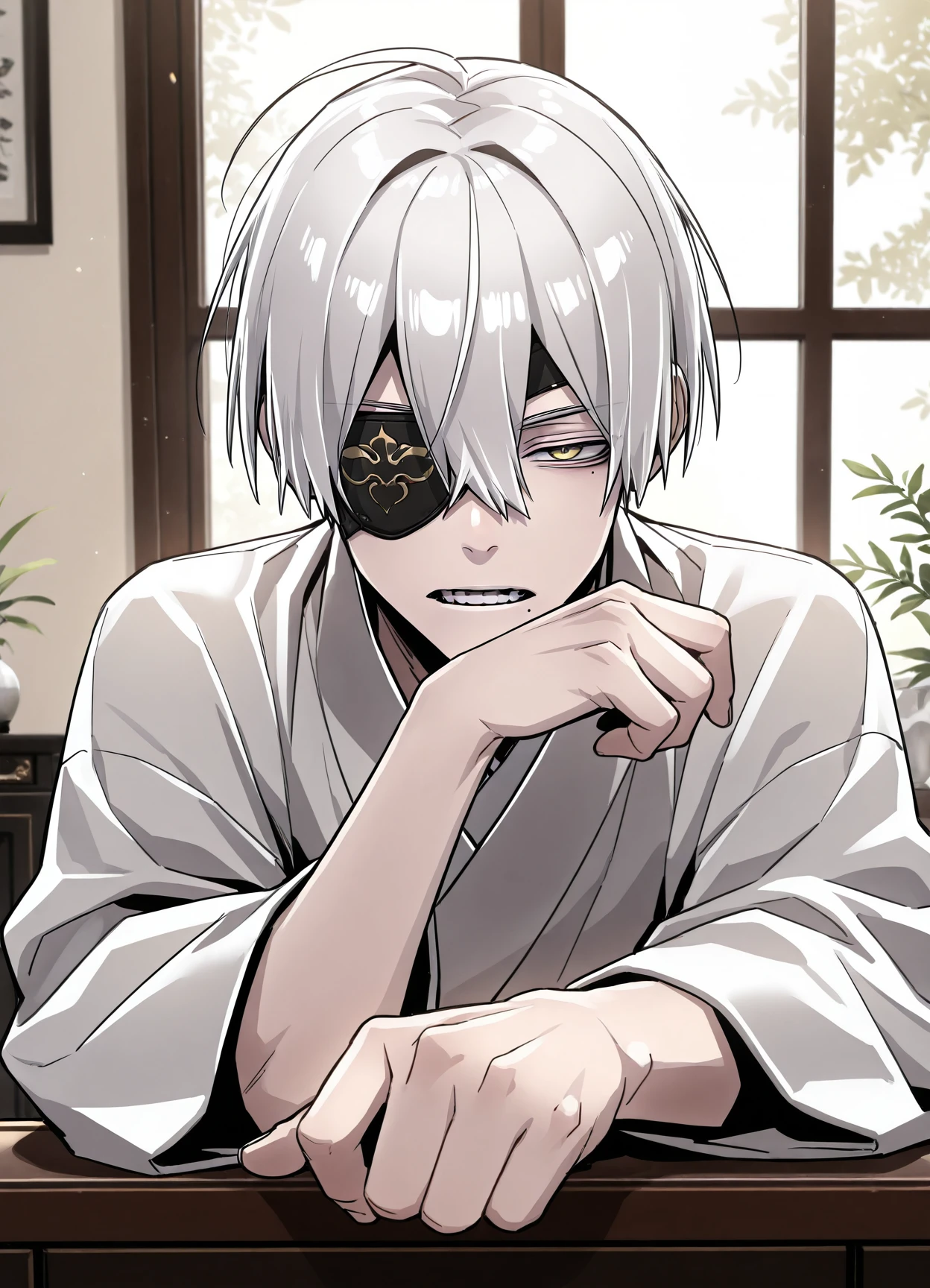 Variation: Cha seongtae,white hair,yellow eyes,narrowed eyes,two mole under mouth,eyepatch,holding a fan,haori.