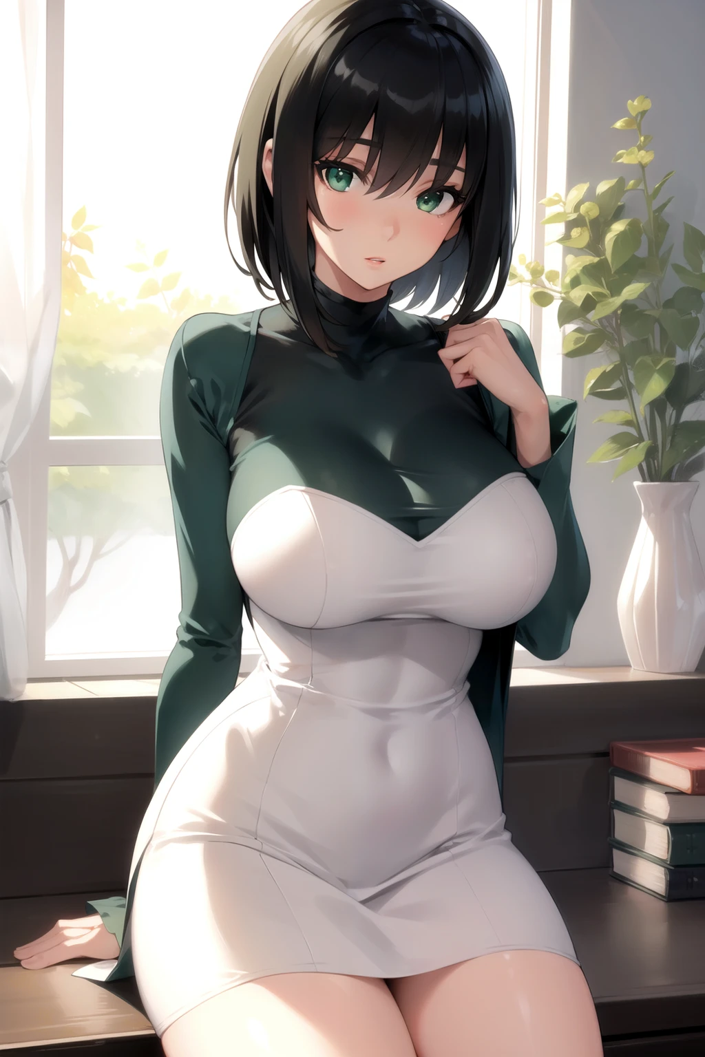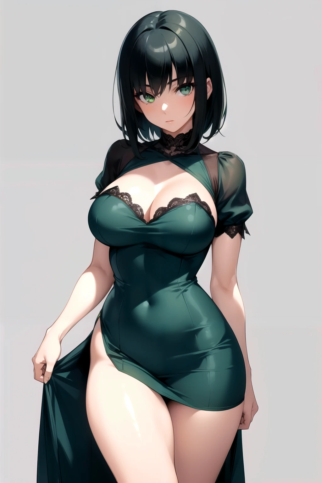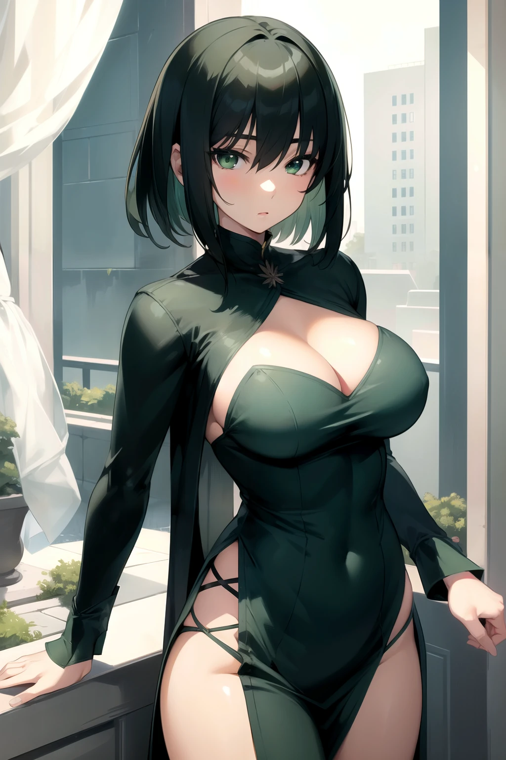 fubuki, short hair, large breasts, green eyes, dress, long sleeves, thighs,