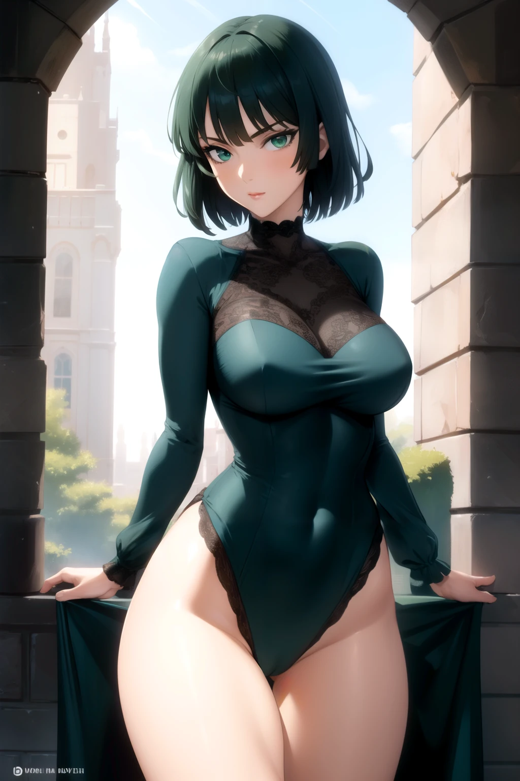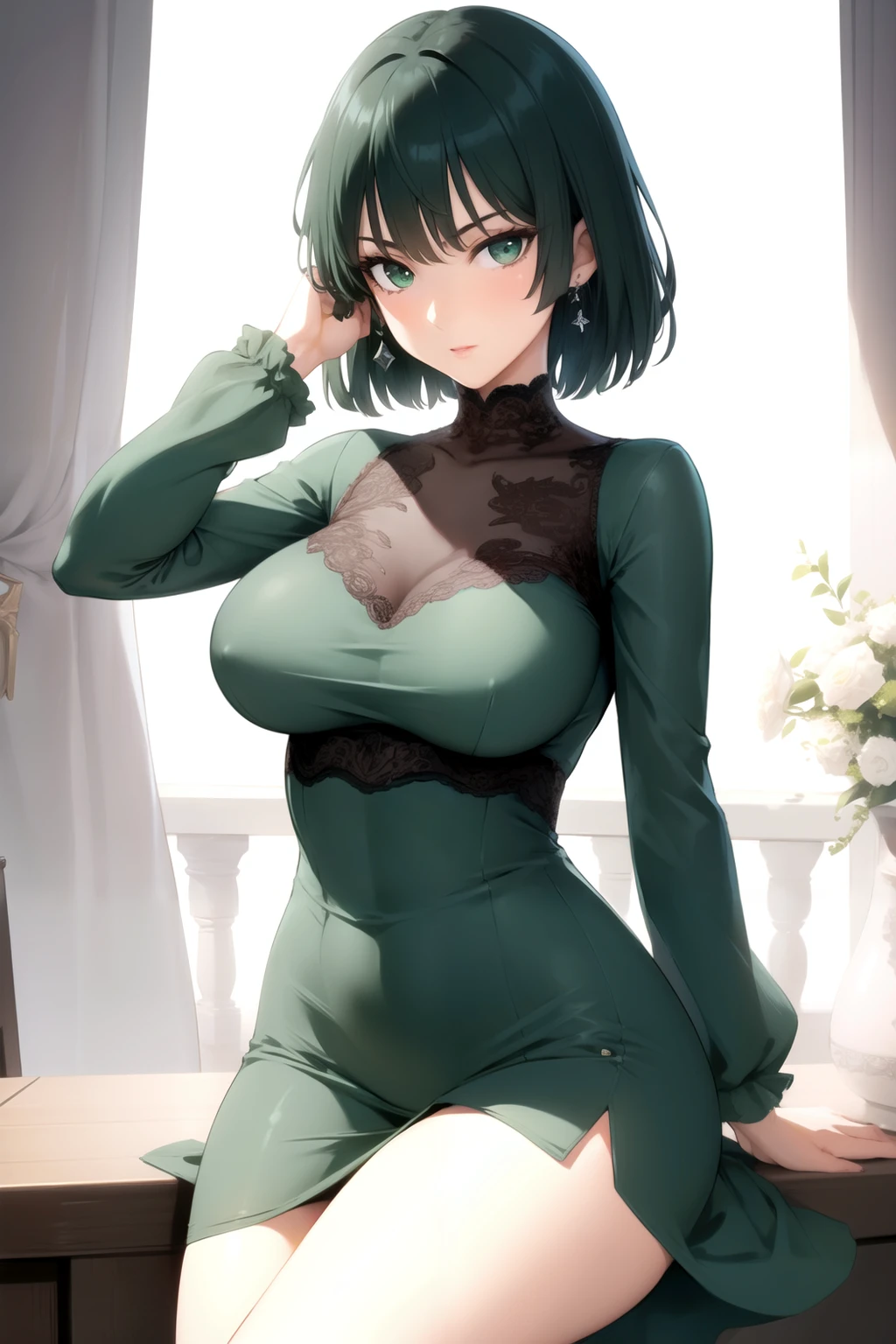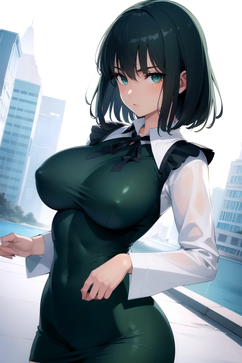 fubuki, short hair, large breasts, green eyes, dress, long sleeves, thighs,