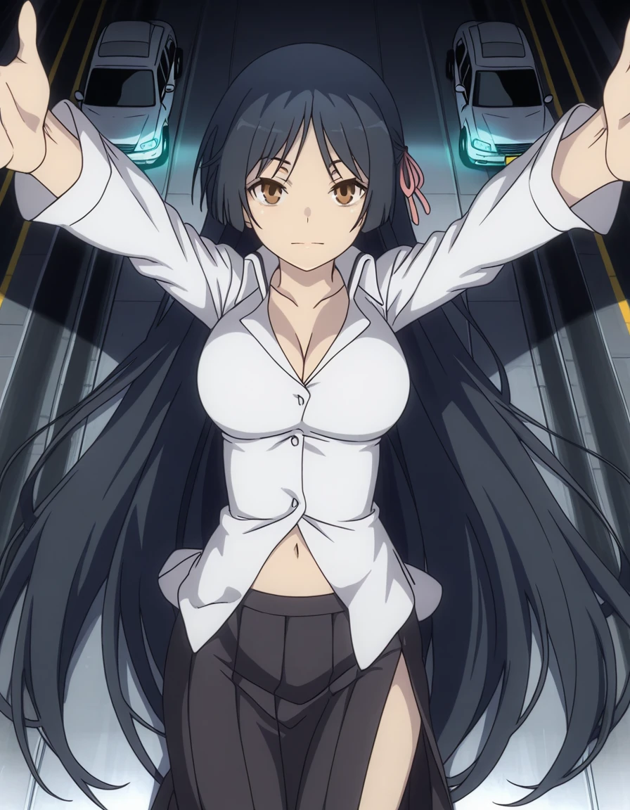 skirt, shirt, navel, cleavage, skirt, black skirt, long skirt, side slit, pleated skirt