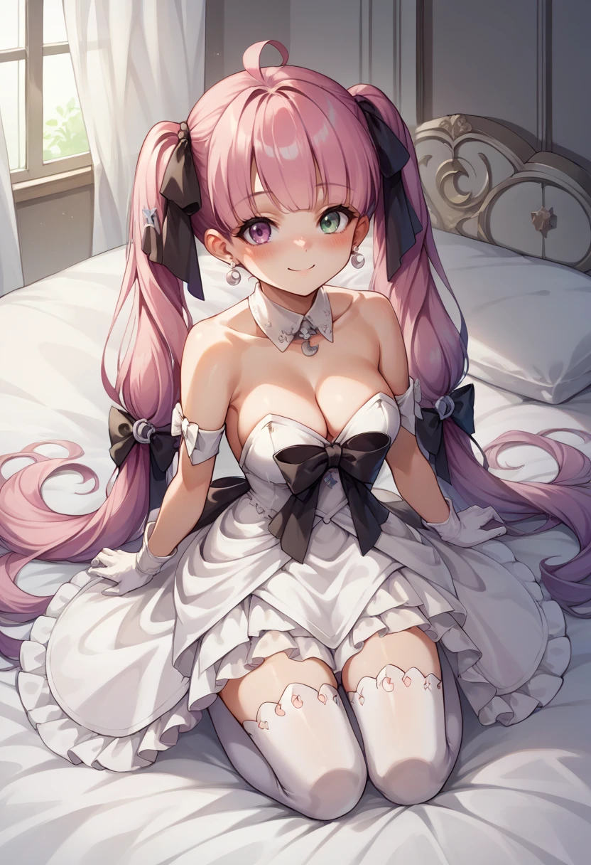 LunaFormal, heterochromia, very long hair, twintails, hair ribbon, earrings, white dress, strapless dress, bare shoulders, cleavage, bow, white gloves, white thighhighs
