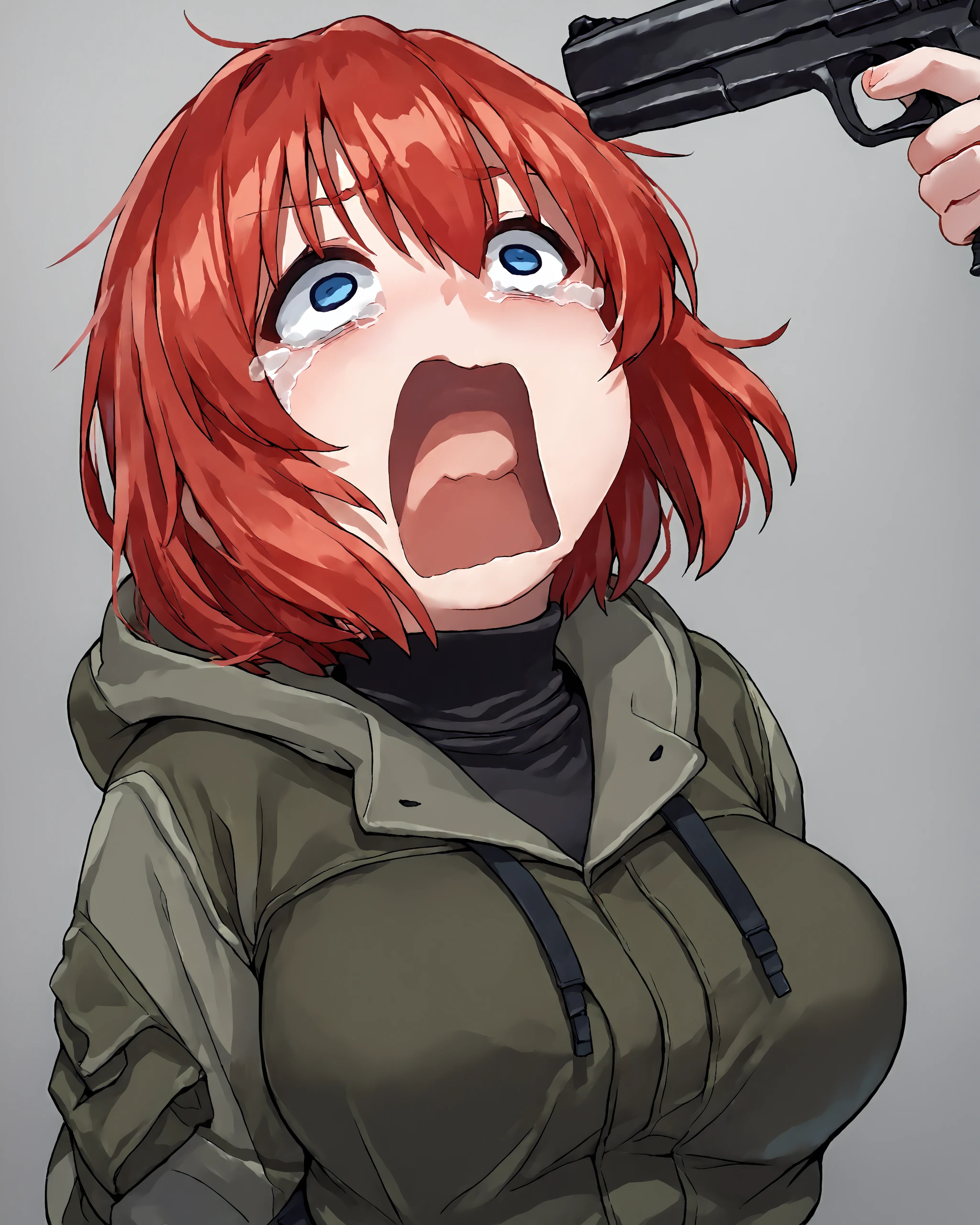 ayesha, red hair, short hair, blue eyes, large breasts,