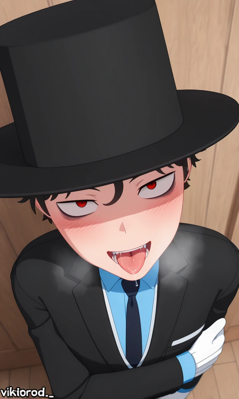 black suit,blue shirt,black hat,black pants,white gloves,neck tie,