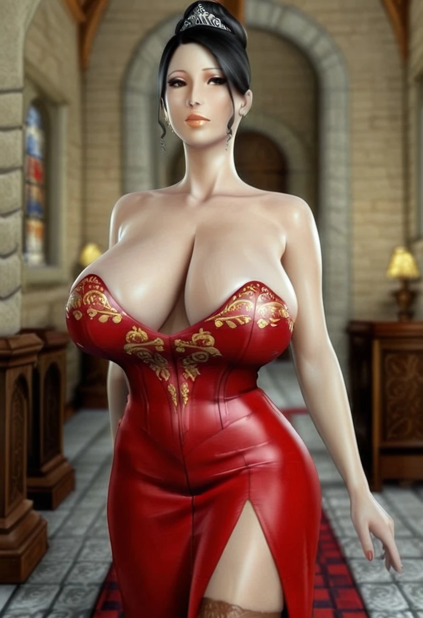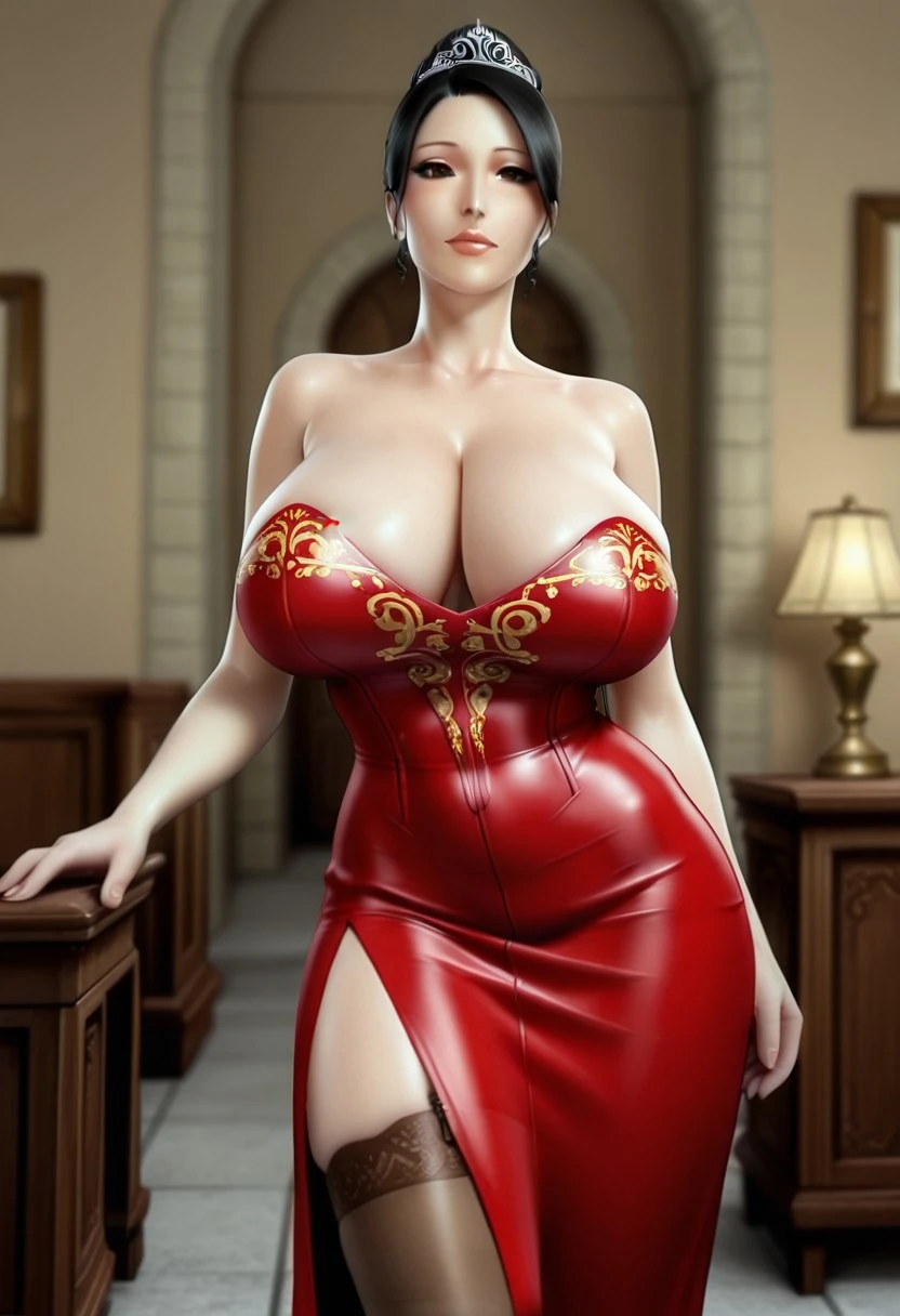 Outfit prompts: red strapless dress, side slit, thighhigh, ring