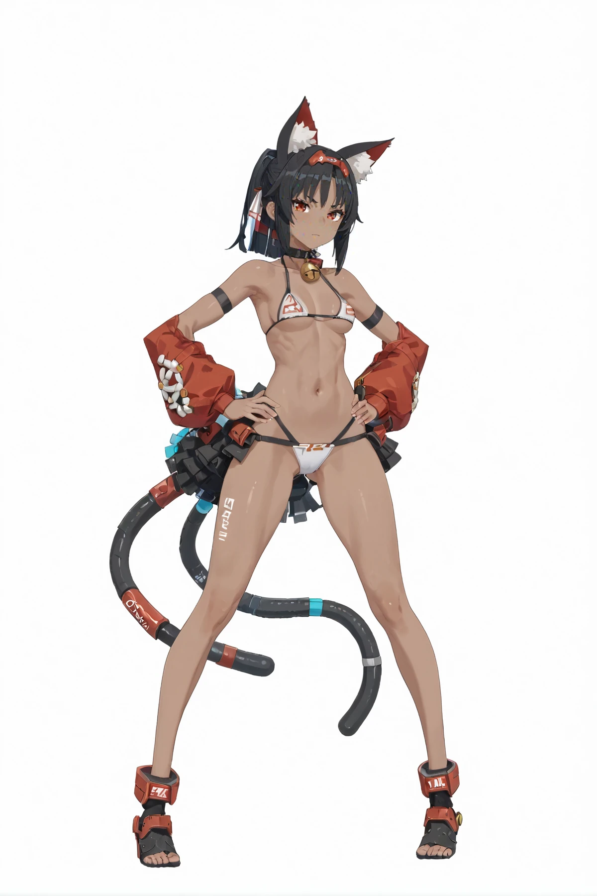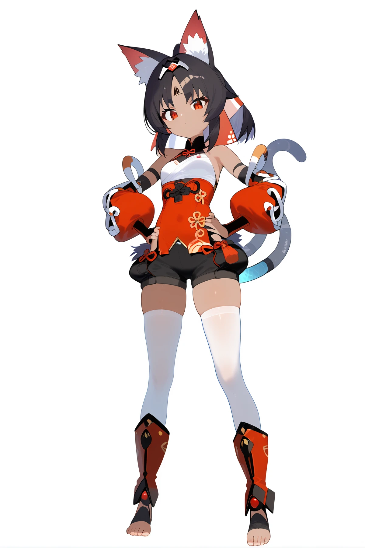 maonai, nekomata girl, default clothes, thighhighs, shorts, 2 tails, red boots, 1girl, animal ears, red eyes, black hair, dark-skinned female, detached sleeves,