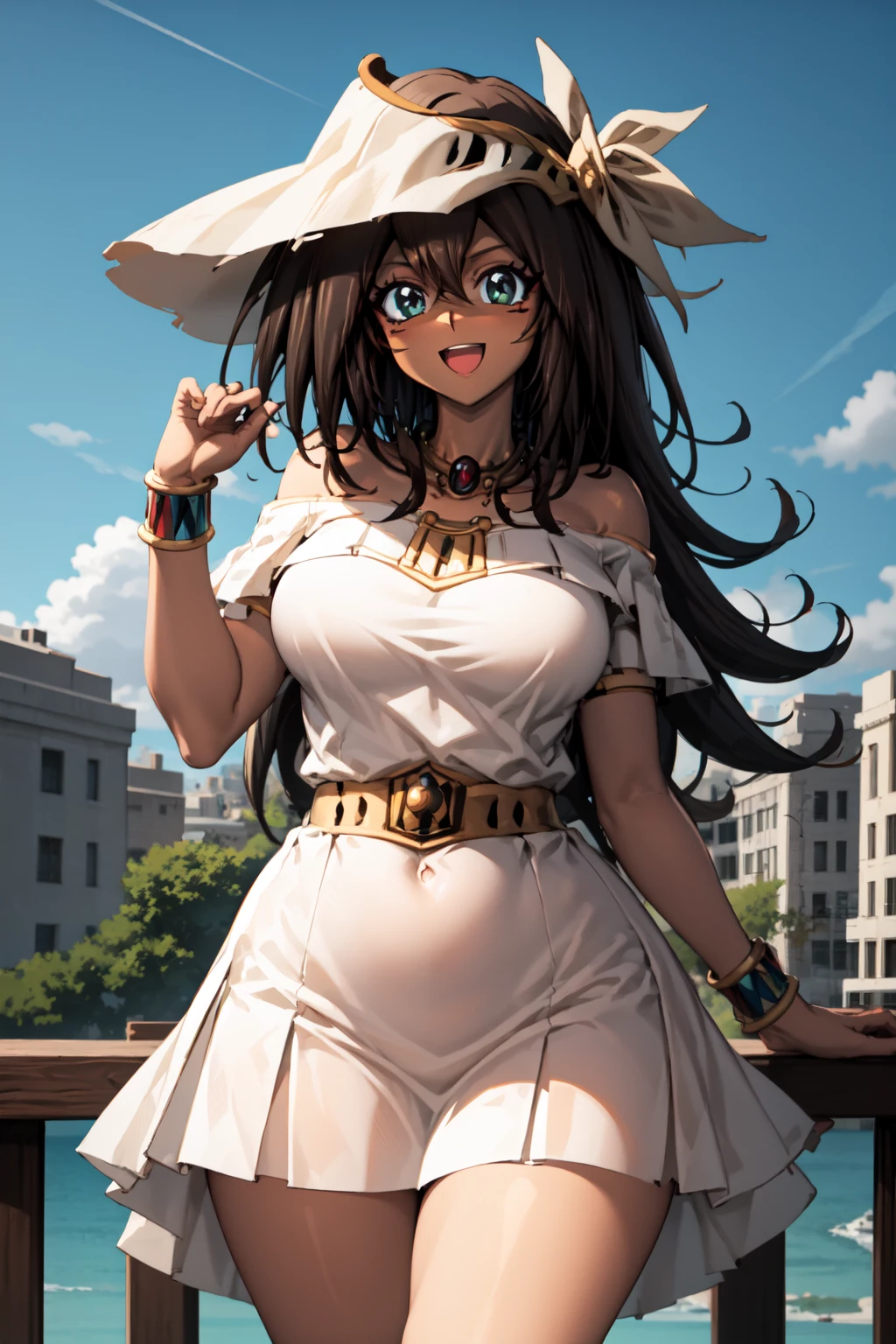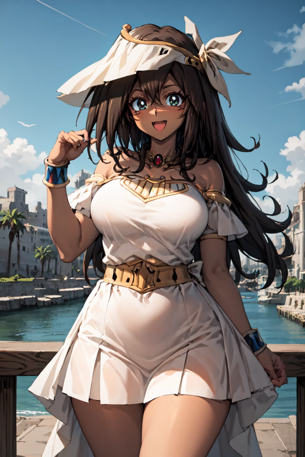 For her outfit use: egyptian, egyptian clothes, eye of horus, anklet, armlet, skirt, white dress, white hat, and off-shoulder. For different outfits place these in the negative prompt.