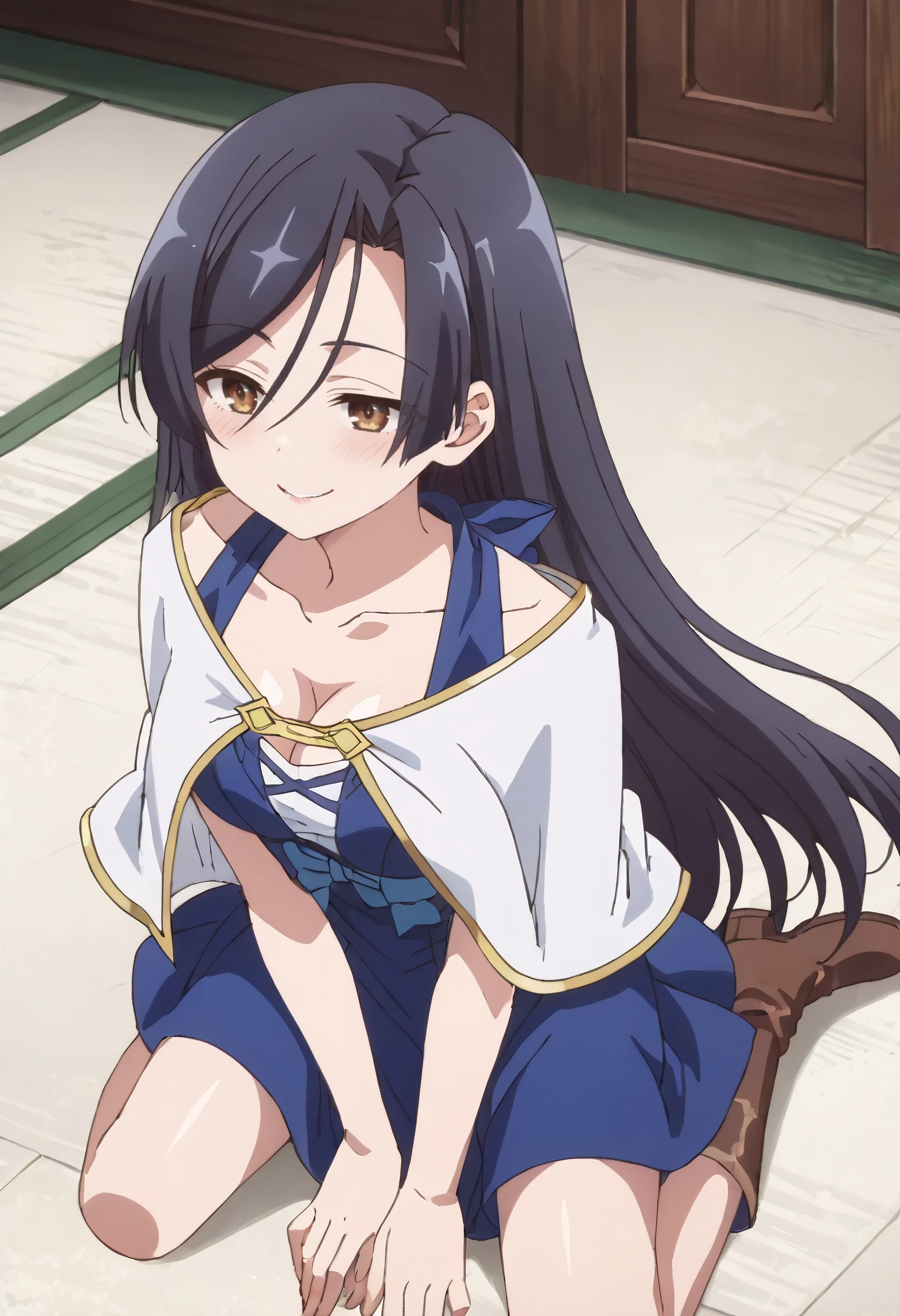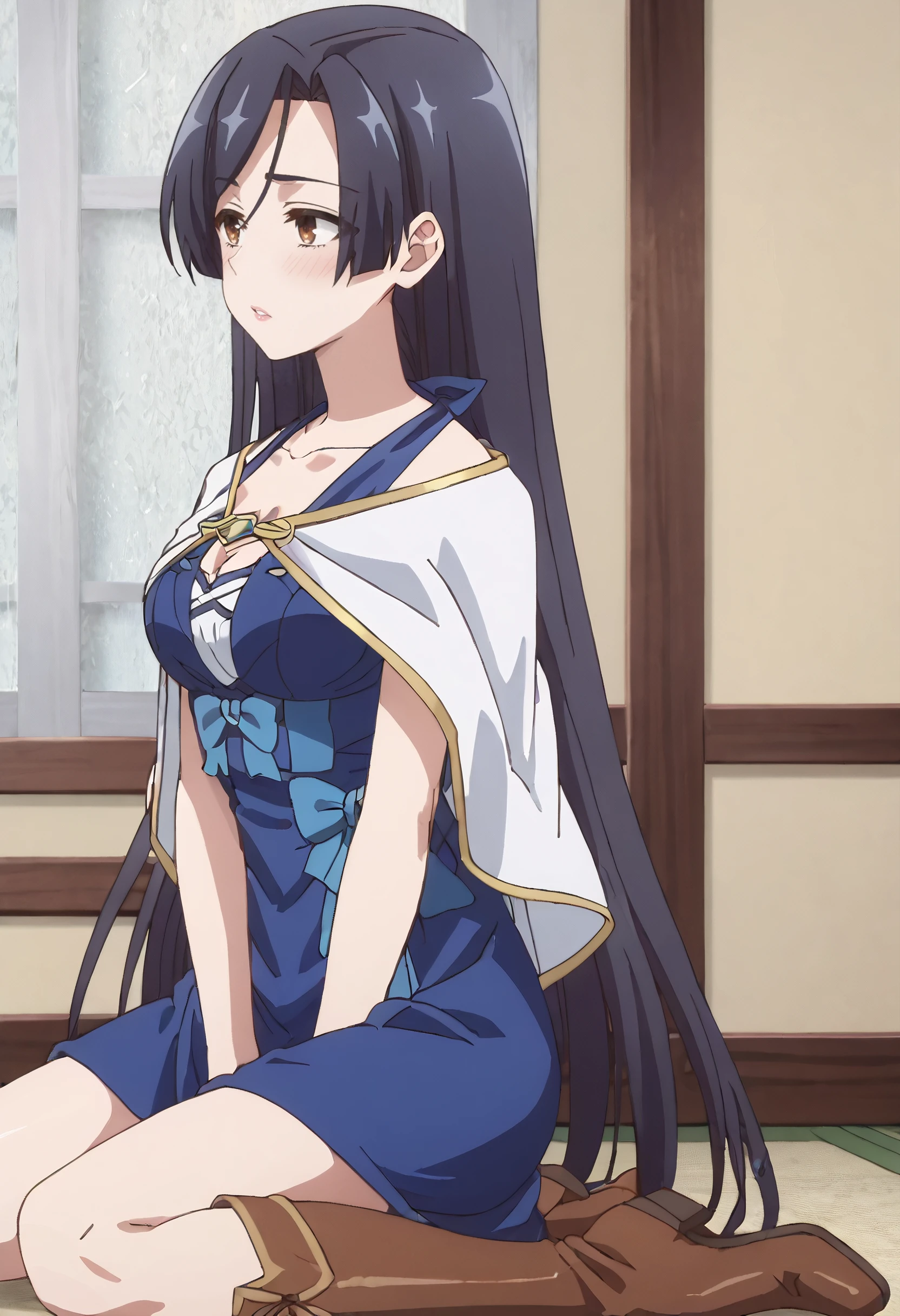 ShirleyDress, capelet, white capelet, dress, blue dress, cleavage, collarbone, straight hair, blue bow, boots, brown footwear,