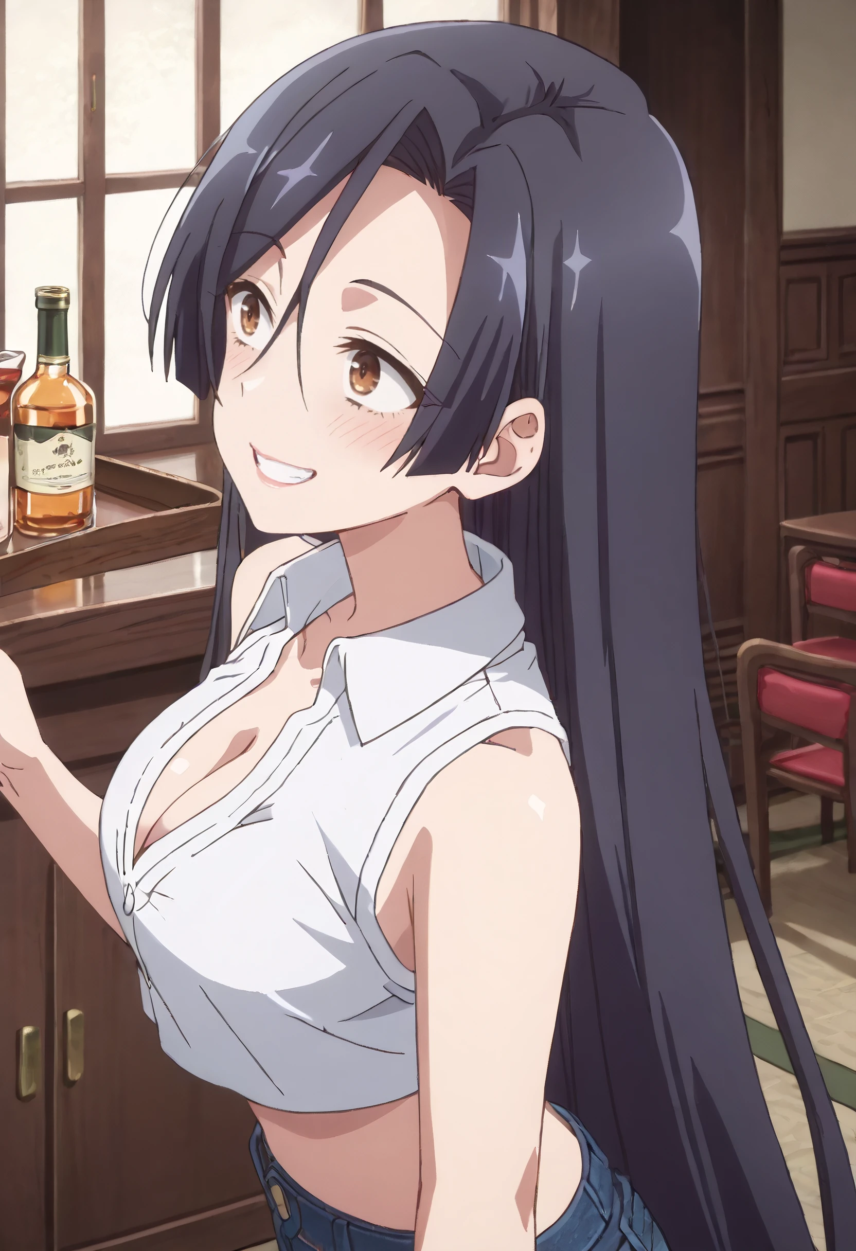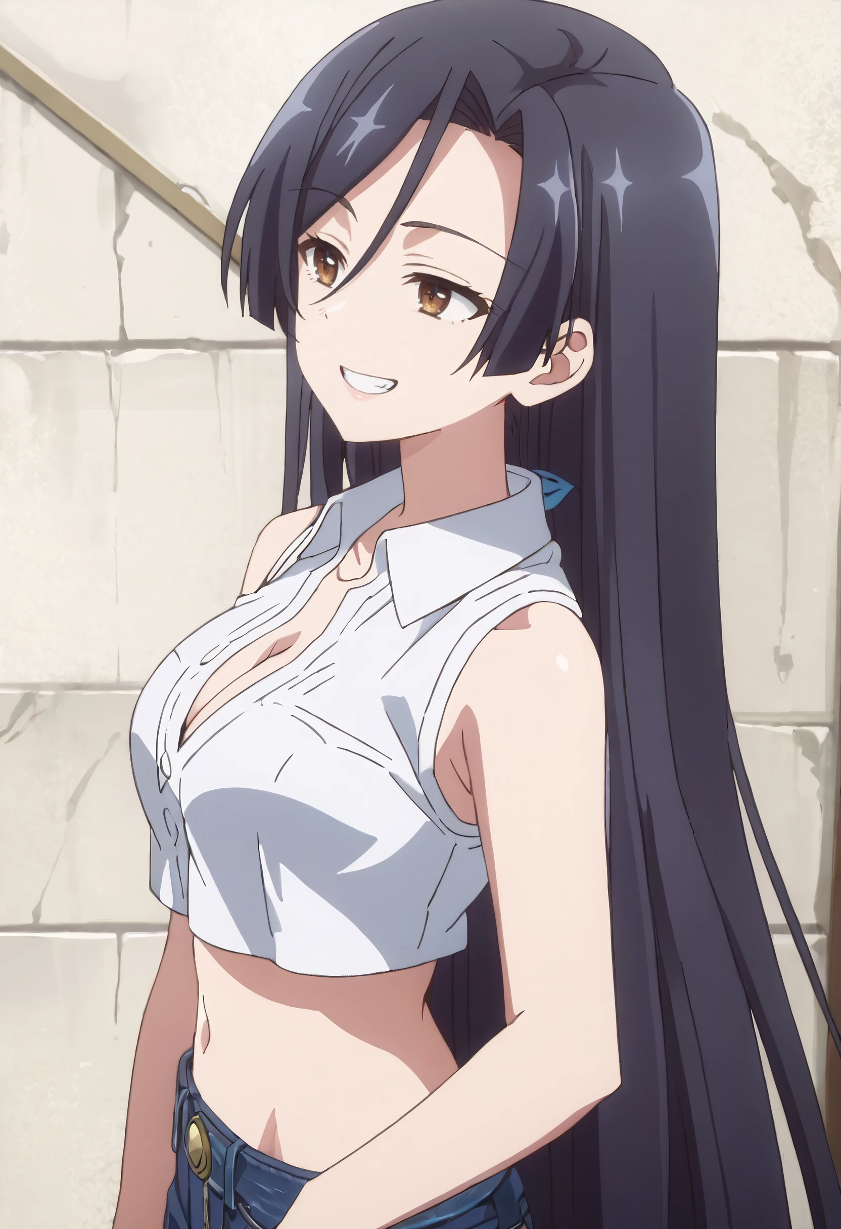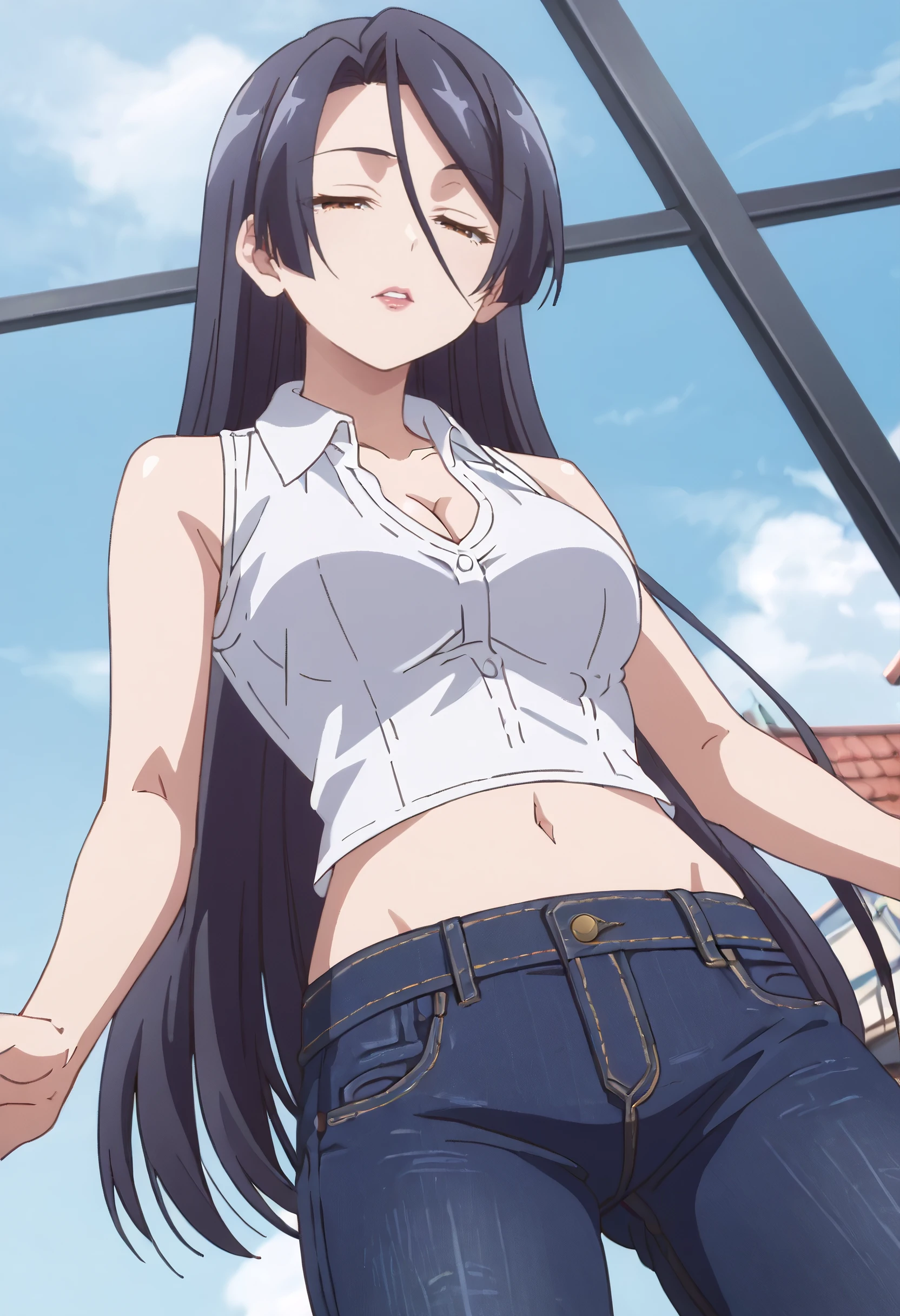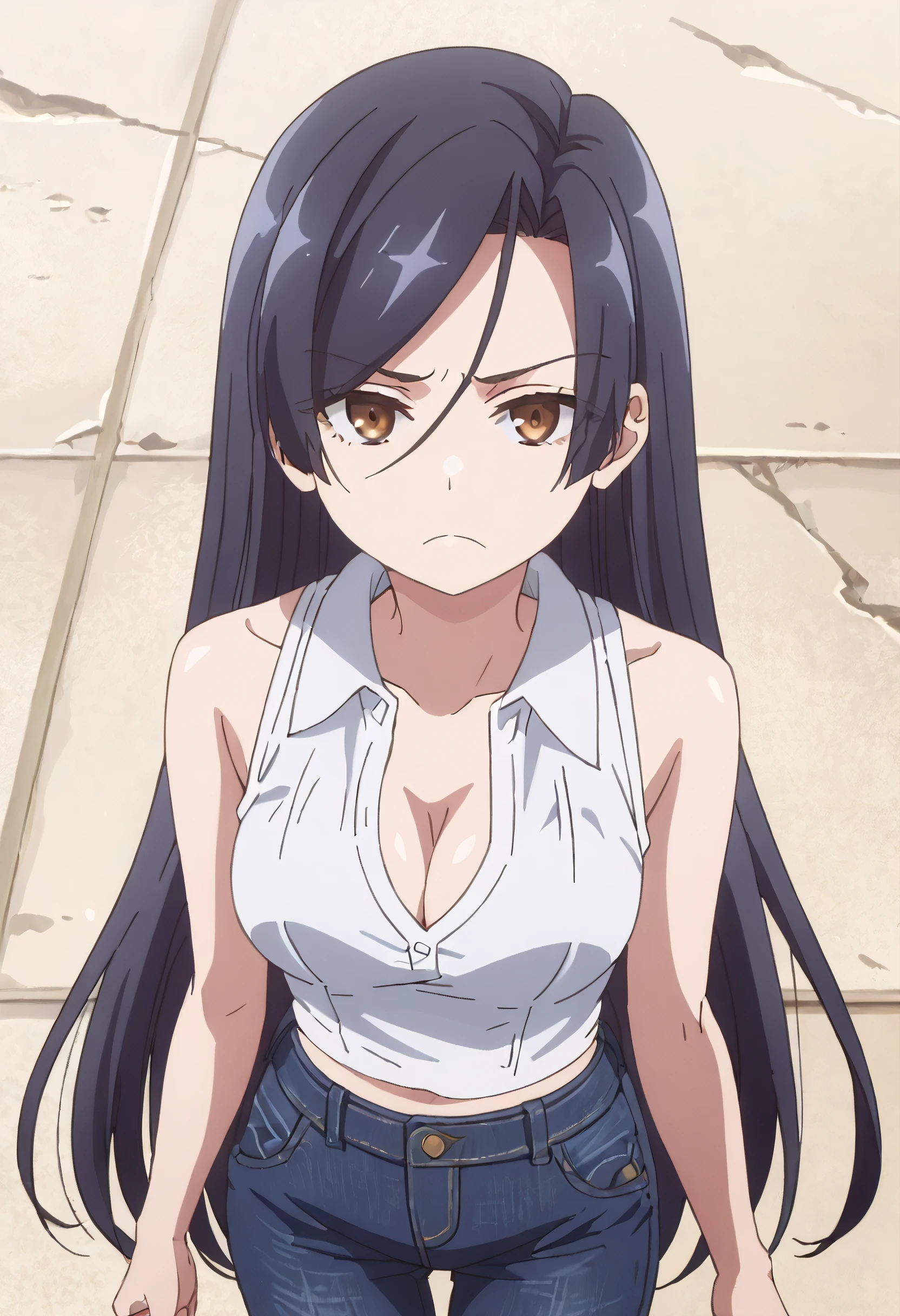 ShirleyShirt, cleavage, sleeveless, sleeveless shirt, shirt, white shirt, straight hair, collared shirt, crop top, midriff, pants, jeans, denim, bare shoulders, cropped shirt, bare arms,