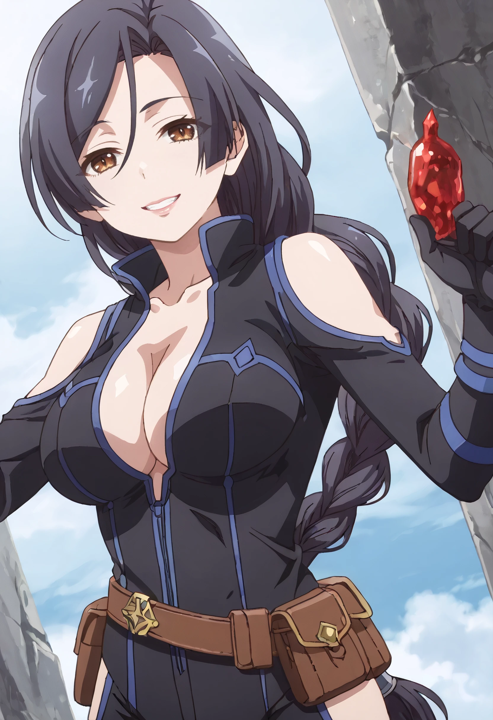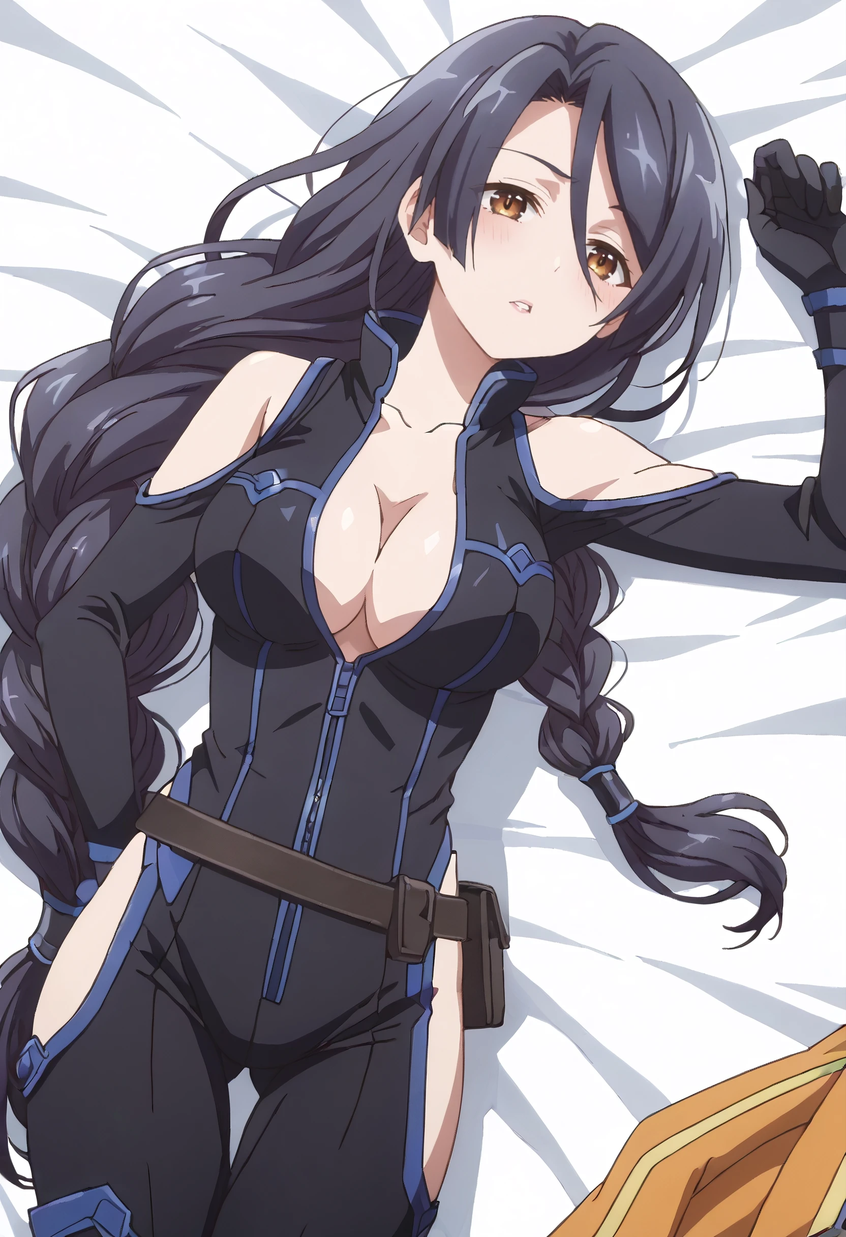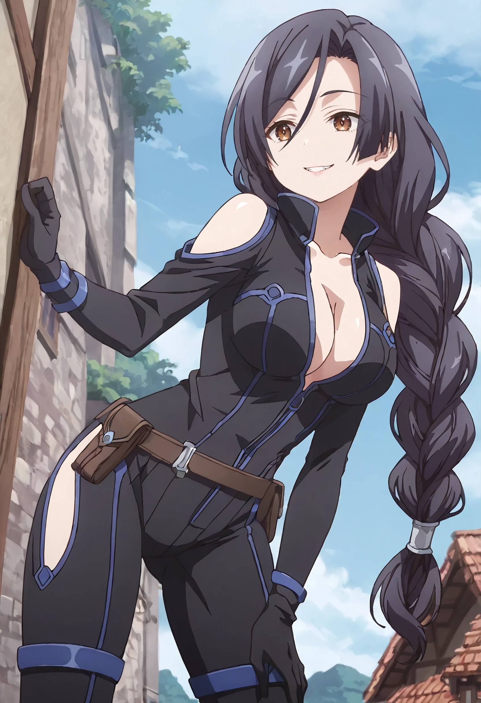 ShirleyBodysuit, shoulder cutout, bodysuit, clothing cutout, black bodysuit, hip vent, black gloves, boots, thigh cutout, gloves, braid, low-braided long hair, low-tied long hair, cleavage, single braid, belt, braided ponytail, pouch, bare shoulders, long braid, open bodysuit, sleeveless, elbow gloves, center opening,