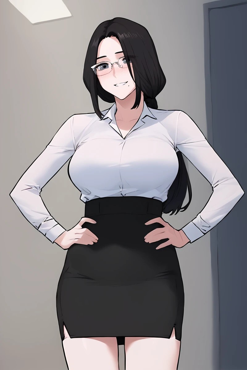 HanYuRi Base Prompt : hanyuri, 1girl, solo, grey eyes, black hair, long hair, low ponytail, sidelocks, forehead, mole under mouth, rectangular eyewear, semi-rimless eyewear, over-rim eyewear, large breasts,