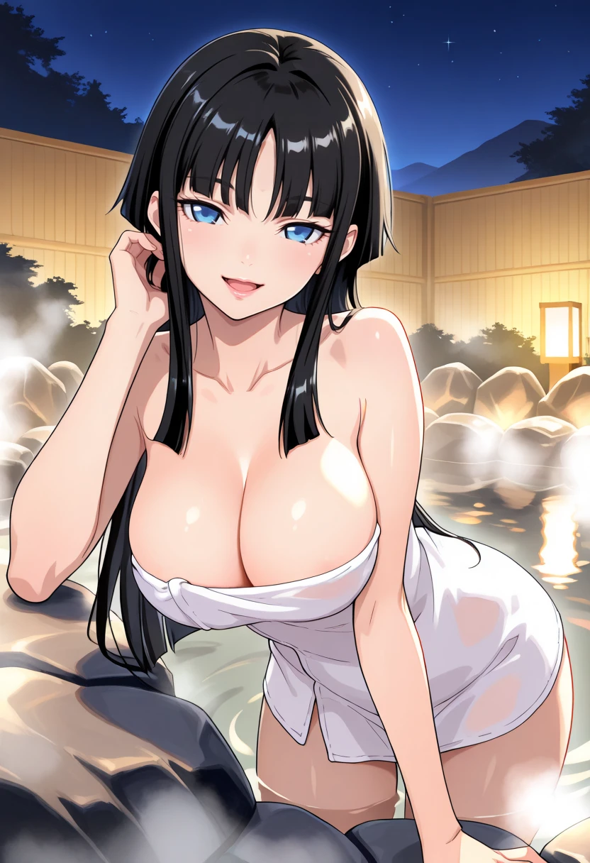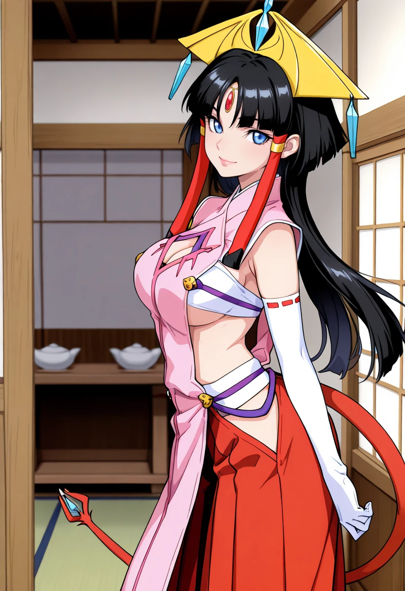pink dress, white sarashi, white elbow gloves, cleavage cutout, red hakama, hair tubes, headdress, large breasts, black hair, blunt bangs, sidelocks, forehead jewel, red tails, long hair, blue eyes, narrow eyes, lips