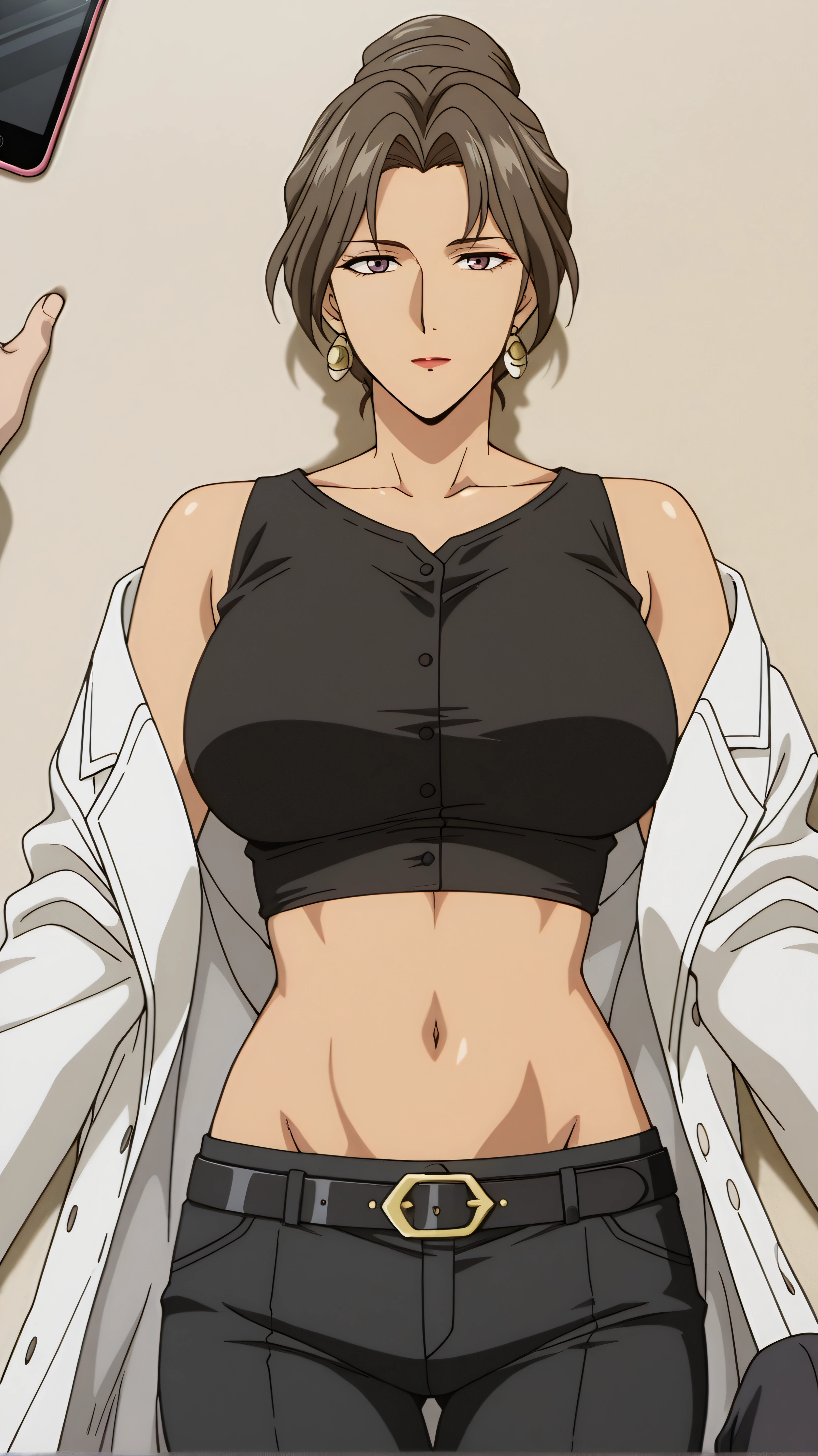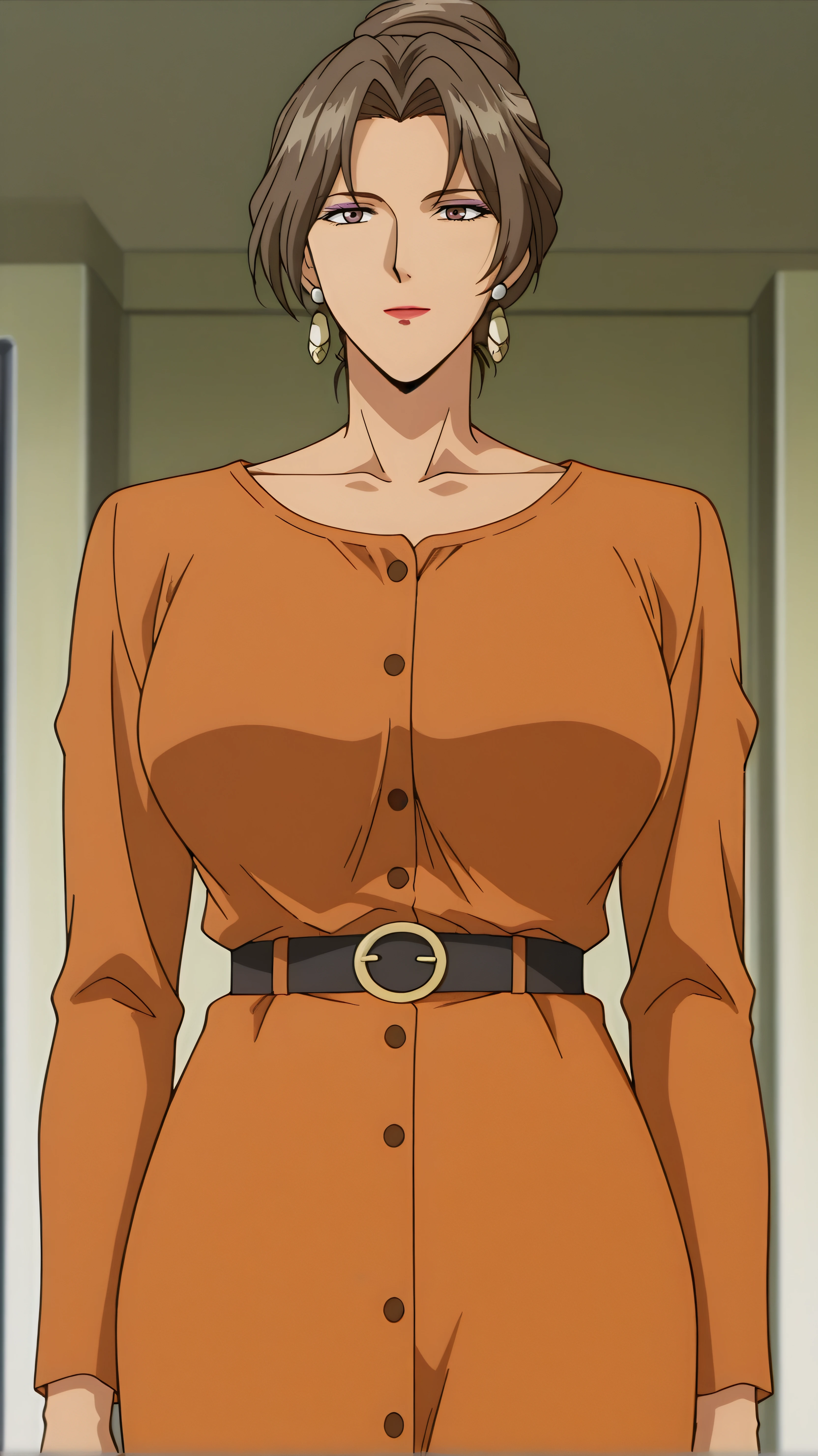 rosa martinez, brown hair, makeup, mature female, hair bun, single hair bun, brown eyes, purple eyes