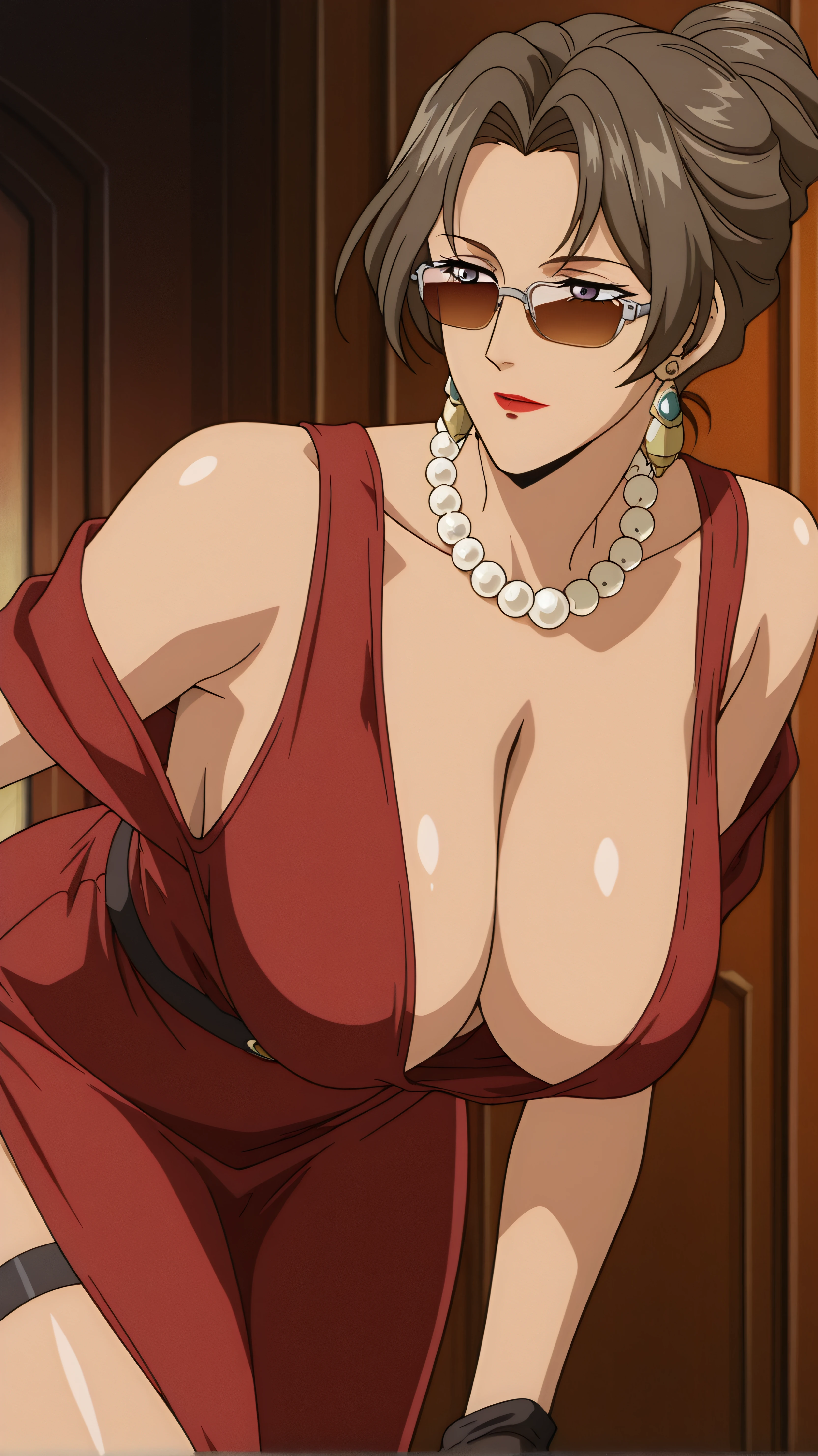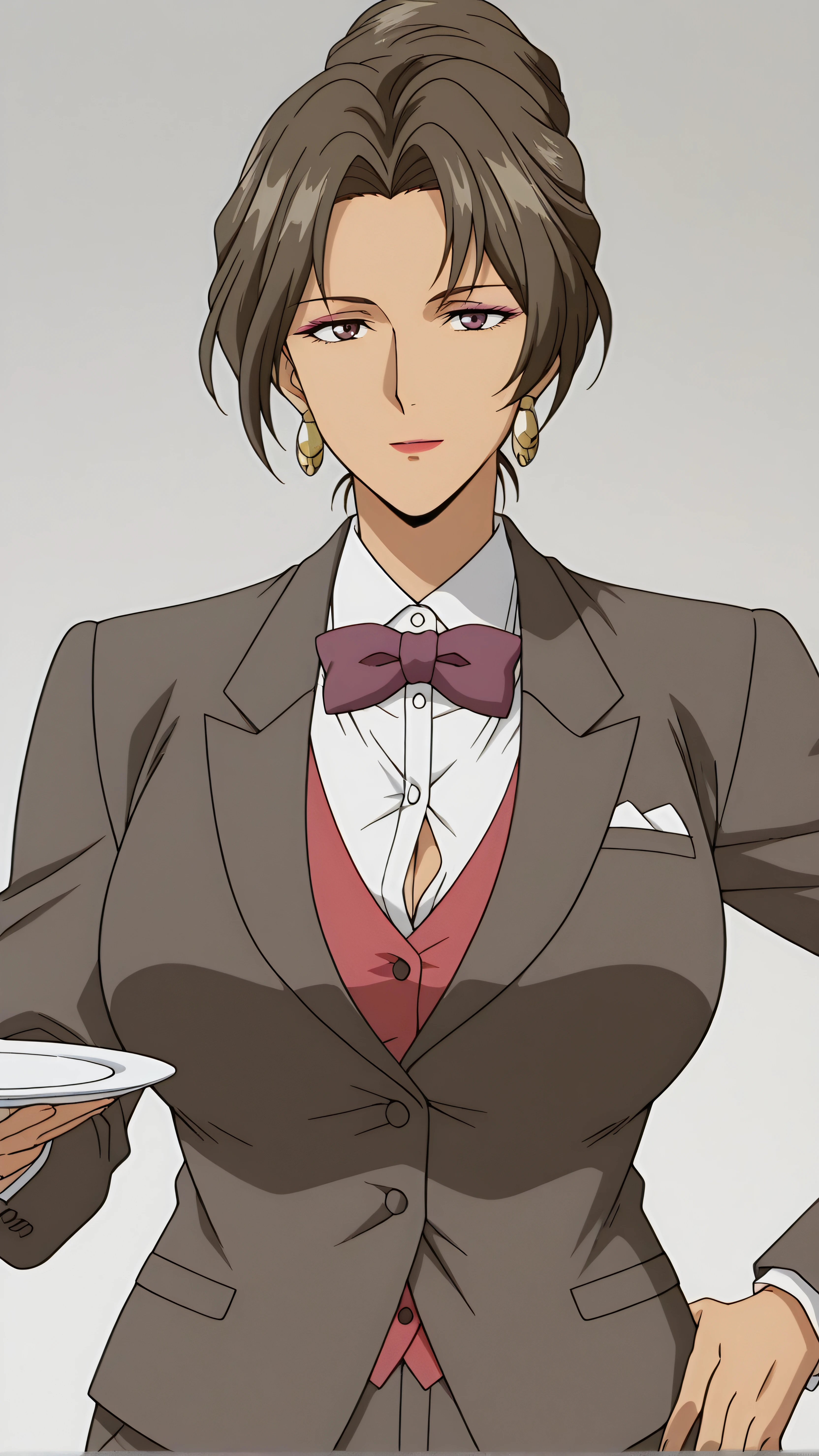 grey suit, jacket,grey pants,, grey shirt, , pearl necklace,