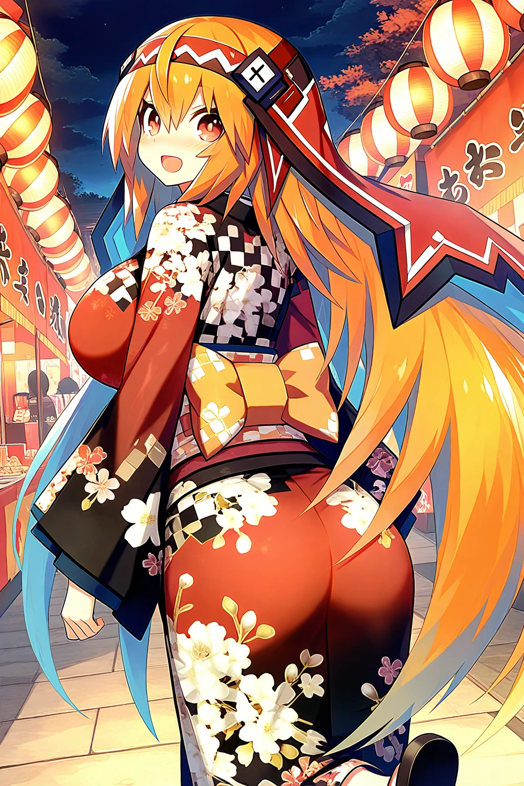 bnt_kmn, cc_bnt, 1girl, solo, red eyes, orange hair, long hair, large breasts, hairband, red veil, kimono, floral print, sash, obi, sandals,